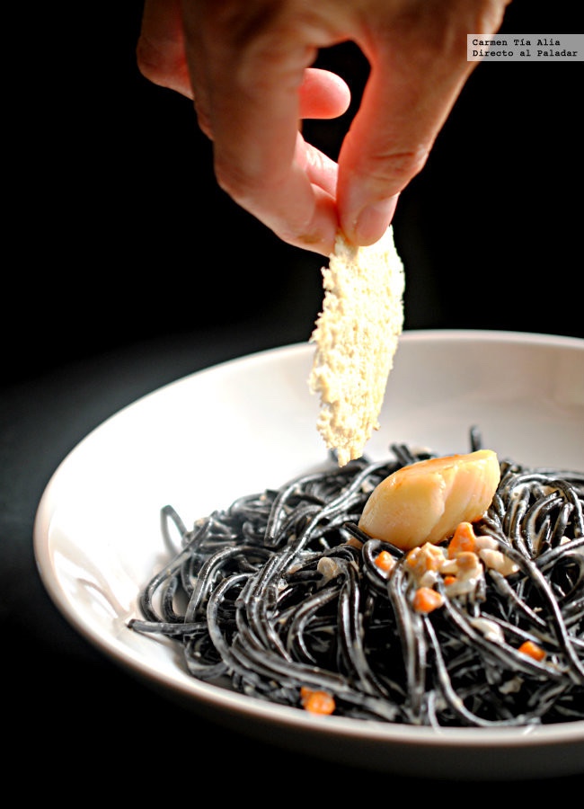 Espaguetis negros con vieiras y crujiente de parmesano
