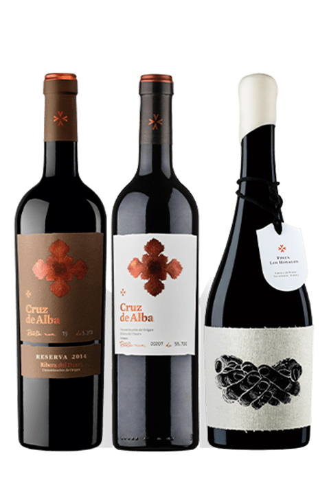 Cruz de Alba 2017.- Este tinto es un coupage de las uvas de viñedos sobre cada uno de los tres tipos de suelos presentes en la Finca Los Hoyales: arcilla, limo y arena. Un total de 18 subparcelas intervienen en la elaboración de este tempranillo 100% que se elabora con control de temperatura durante la fermentación y cuya crianza se produce en barricas nuevas de roble francés y una proporción de roble americano durante 15 meses.