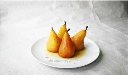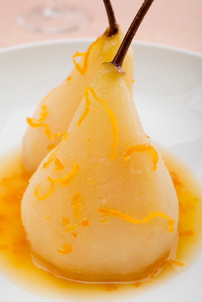 Presentación: Sirve una pera por comensal. Para ello prepara un plato o un bol y sirve un poco de almíbar en la base. A continuación, coloca una pera con el rabito hacia arriba y sírvelas con unas tiras de piel de limón fresco o rallado.