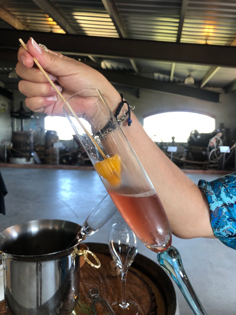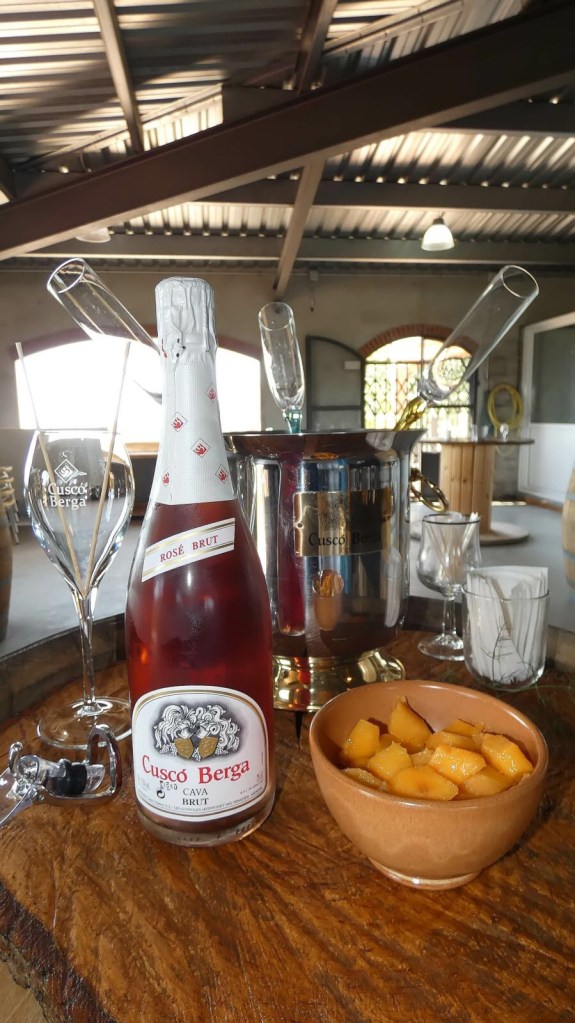 marinat amb préssec d’Ordal, també de collita pròpia, aquest préssec és un producte de qualitat aromàtica i gustativa, que a l’ésser un producte de secà li atorguen una aroma i un sabor molt preuat i a trossets impregnat de l’Rosé Brut, de CUSCO BERGA va resultar ser una combinacióextraordinària, i aquesta experiència et l’ofereixen a CUSCO BERGA, heu de provar-la