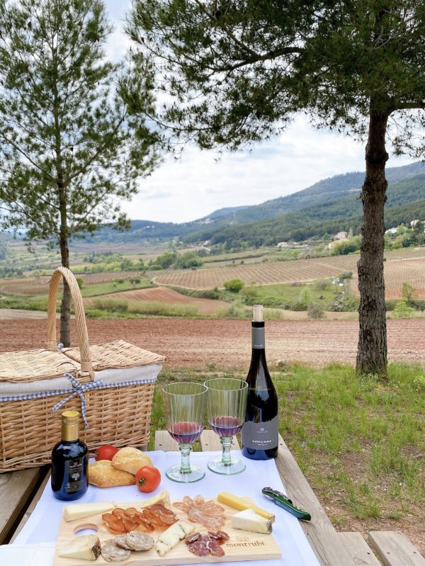 -Selección de quesos y embutidos artesanos, 1 botella de vino, pan con tomate, aceite de oliva de MontRubí, fruta de temporada.