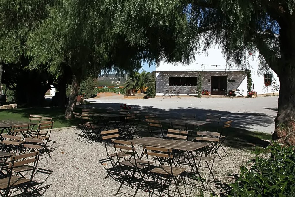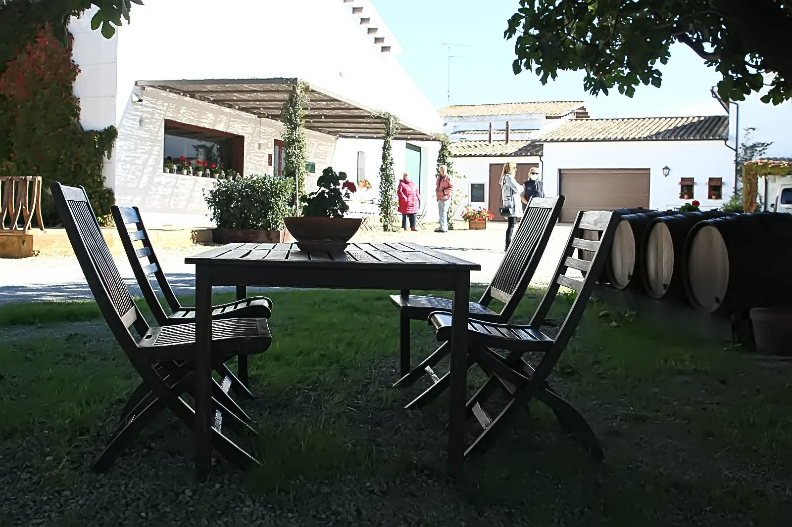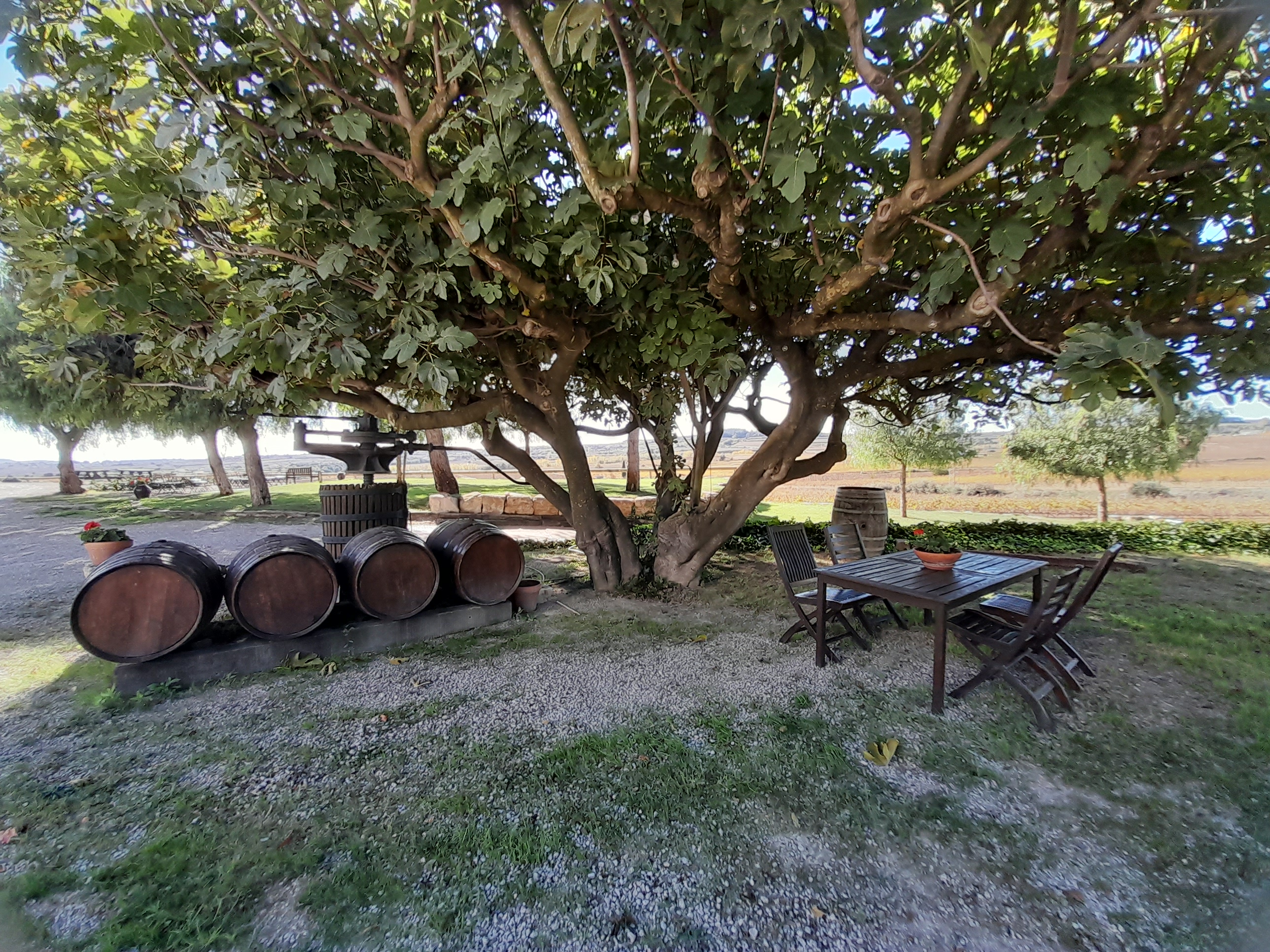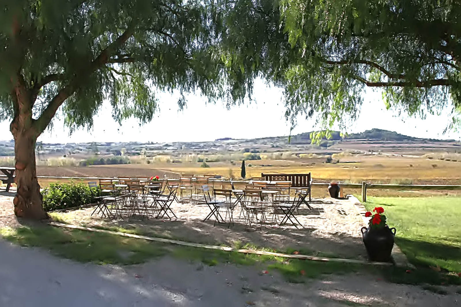Després de la visita al celler, les instal·lacions i l’explicita i interessant explicació de la Marta, sortim al jardí al Wine Bar, un entorn meravellós, plàcid, un paisatge que enamora, amb les vinyes de fons, que amb l’inici de la tardor canvien el color i tenen un altre atractiu, uns preciosos arbres de falsos pebrers, unes ideals i adients taules i cadires posades amb gràcia a la gespa fan del jardí un bell espai amb una bella harmonia, ideal per relaxar-te, i gaudir del moment mentre