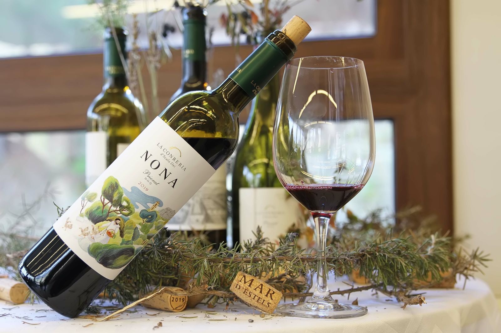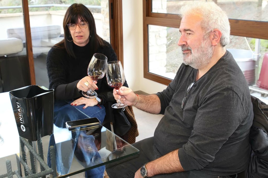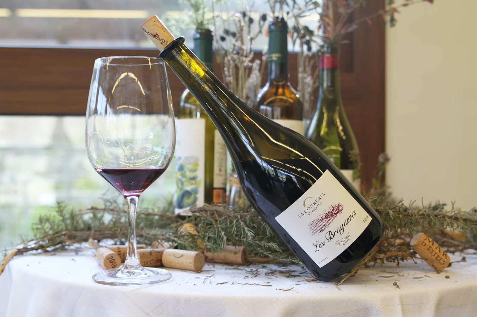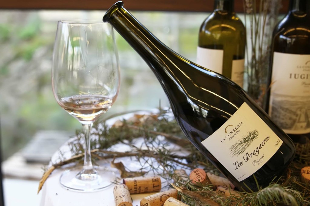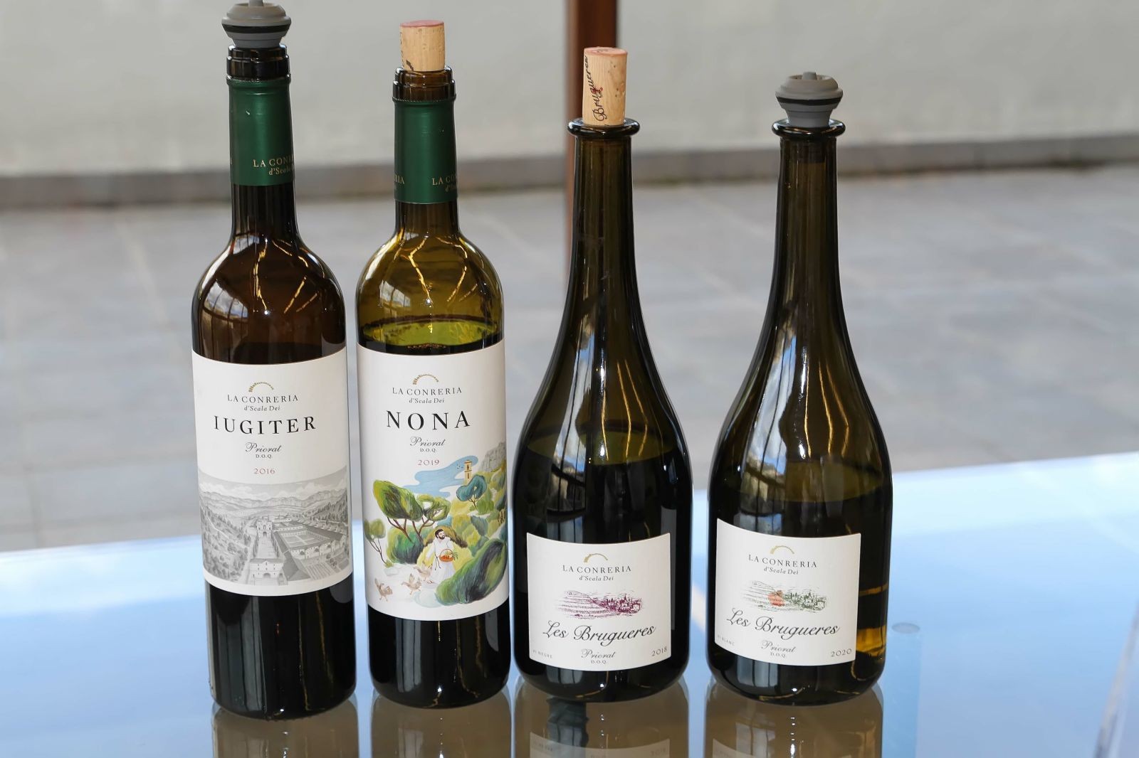 Per finalitzar realitzem un tast de 4 dels seus vins, en una espaiosa i diàfana sala, que és al primer pis i des de les grans vidrieres d’aquesta, s’albira l’esplèndid paisatge del Priorat i les seves vinyes. Aquí degustem els suculents vins les Brugueres Blanc, Les Brugeres Negre (tinto criança), Nona (tinto) Iugiter (tinto criança).