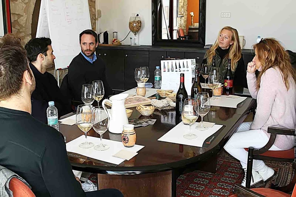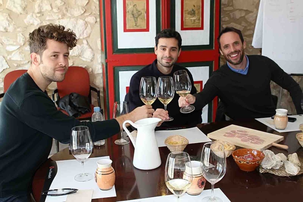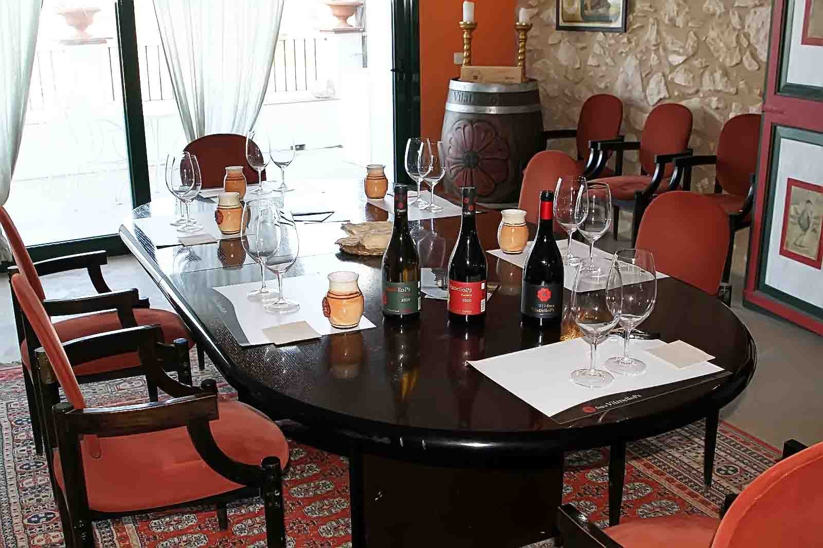 Después de un viaje por el pasado y los viñedos, llegamos a la bodega donde profundizamos en la elaboración de los vinos tanto en tanques como en barriles, de roble francés y marcados todos ellos con la Rosa del escudo de los “Desvalls” Marqueses de Alfarràs, donde reposan los que luego serán los vinos Premium de Viladellops, magníficos, esplendidos, y desde las bodegas fuimos a la Sala de Consells o Tast, donde realizamos la cata, una distinguida sala, decorada con gusto y elegancia, con una terraza con bellas vistas a los viñedos, y en medio de la sala una gran y señorial mesa