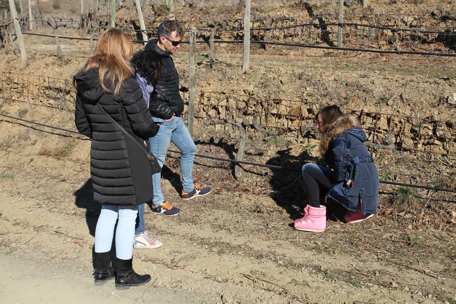 La visita empezó delante de un mapa, en el cual Carlota nos introduce en el mundo Priorat, con una ilustración del terreno del Priorat y Montsant, y donde tienen ubicadas sus viñas y las variedades de las mismas y una vez situados y más conocedores del Priorat, sus tierras y la ubicación de las viñas de Perinet , nos dirigimos a las viñas, donde observamos que la plantación es diferente a la del Penedès, por la ubicación, los viñedos están construidos en unas terrazas tecnológicamente avanzadas, con plantaciones de alta densidad, una extensa y didáctica explicación sobre las mismas, su cultivo y laborioso trabajo y responsabilidad que realizan ya que todo es manual y bajo el estricto compromiso con la D.O.Q., Contienen un predominio de variedades locales como Cariñena y Garnacha, acompañadas de variedad internacional como Cabernet Sauvignon, Syrah y Merlot