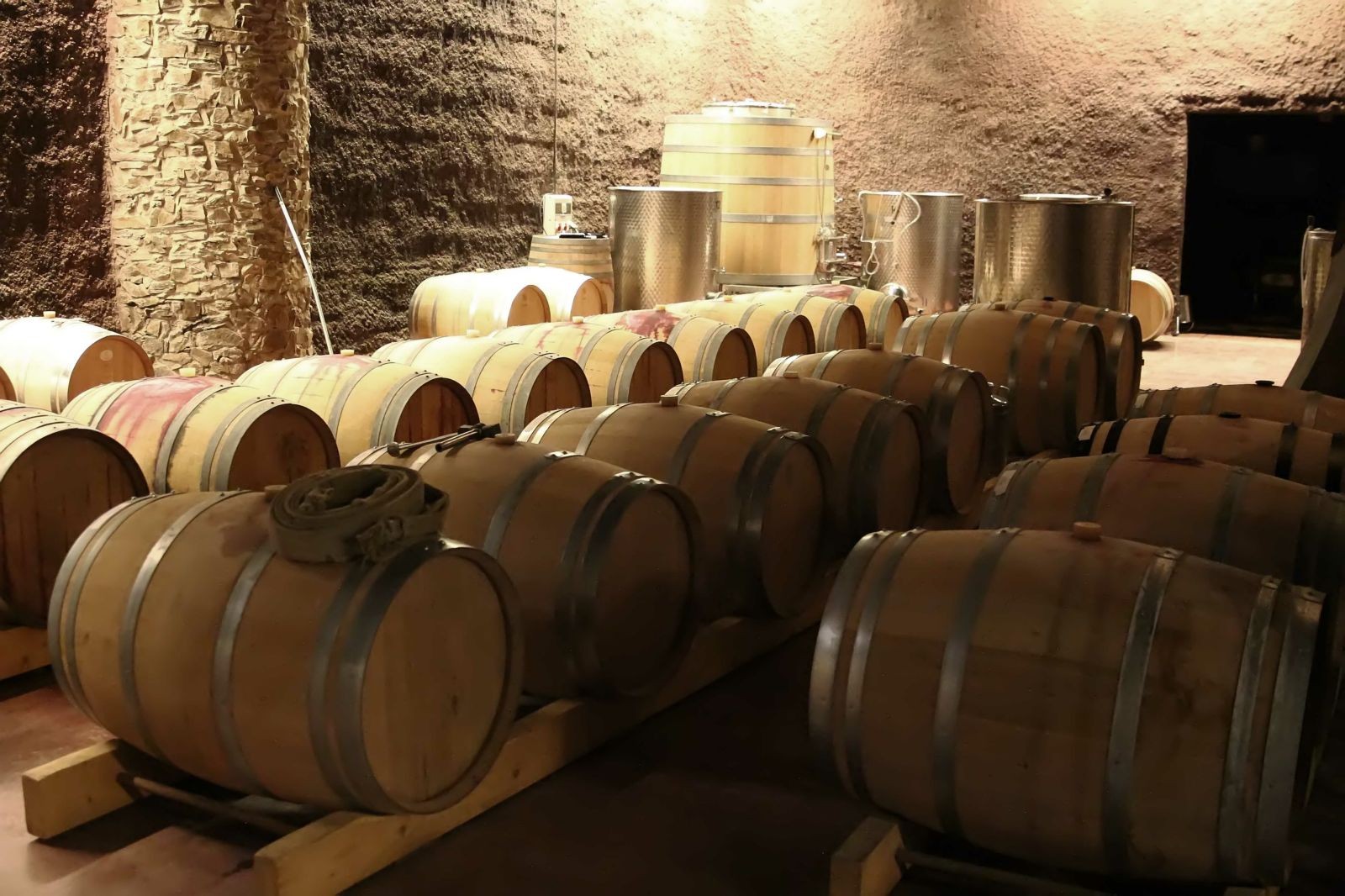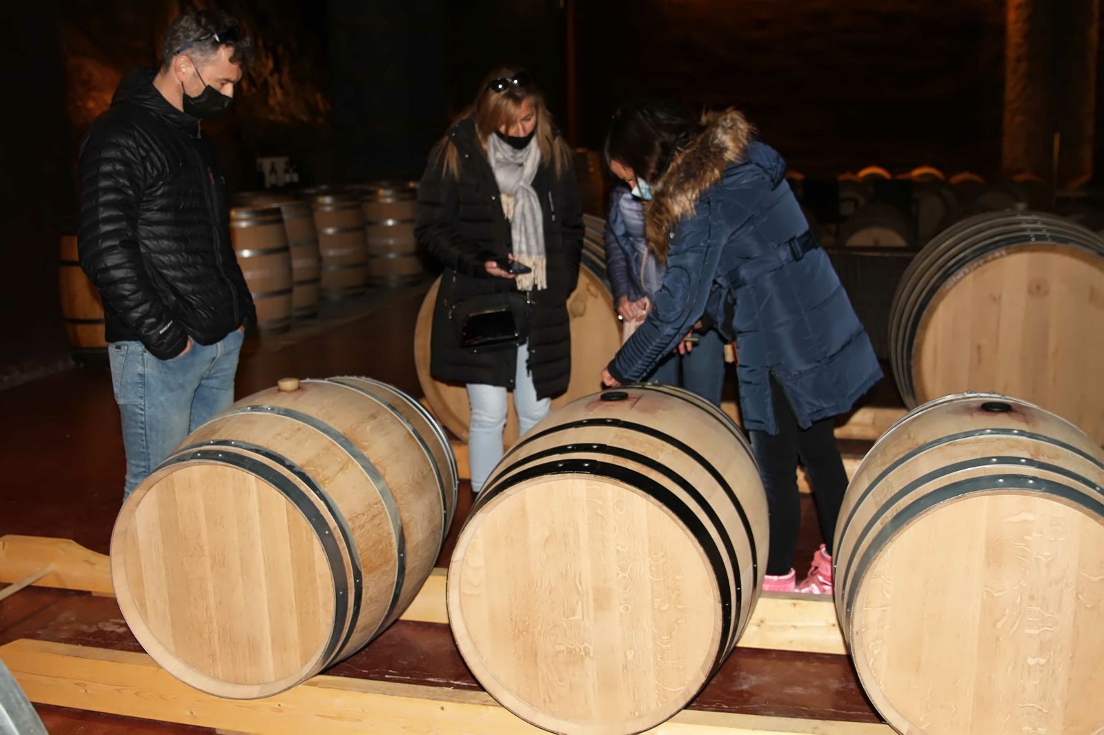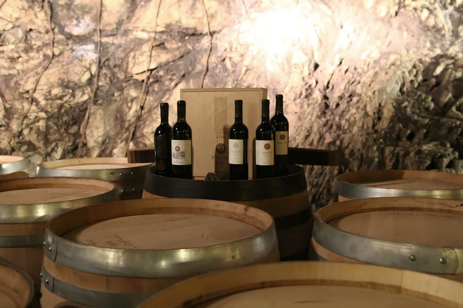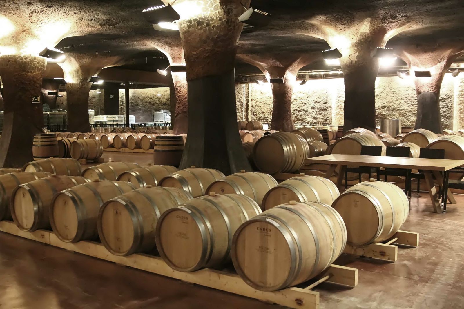 De aquí ya fuimos a la bodega de barricas, espectacular, incomparable, sin palabras, cuando entras ya quedas encantado, seducido por el lugar, la arquitectura de la bodega destaca por su elegancia y espectacularidad, luz tenue, llena de barricas de roble francés, entre varias y grandes columnas reproducidas estilo Gaudí, podrías, perfectamente, presuponer que estas en alguno de los edificios de Gaudí, o el parque Güell, hay una de las paredes que no está terminada, se dejó vista deliberadamente, donde todo es roca de licorella , por la que bajan unos hierros estratégicamente puestos con gracia y simbolizando las raíces a las raíces del Priorat muy largas y verticales, en el techo de las misma hay 4 claraboyas que pueden abrir o cerrar cuando lo necesitan y lo más extraordinario es que estas claraboyas son las chimeneas que hay en la entrada del jardín de Perinet, que también son un Guiño a las chimeneas de Gaudí. En este bello entorno, en las barricas descansan los grandes, artesanales y de alta calidad los vinos de Perinet, hasta que llega el momento de llevarlos a nuestro0 hogar.
