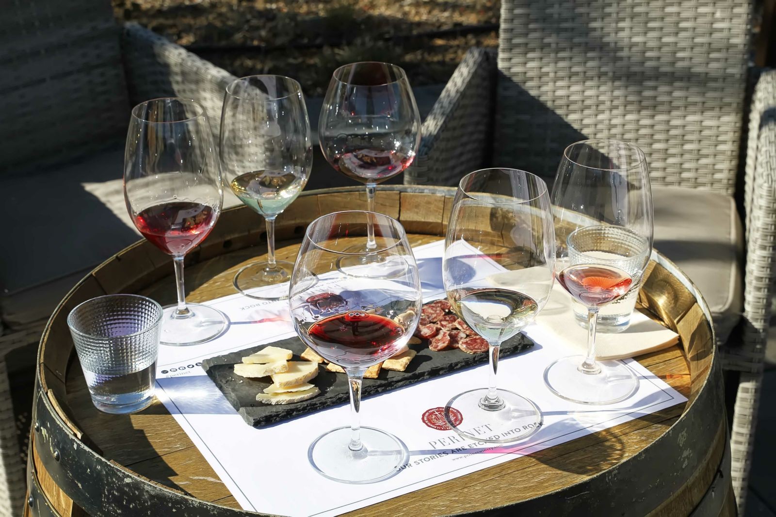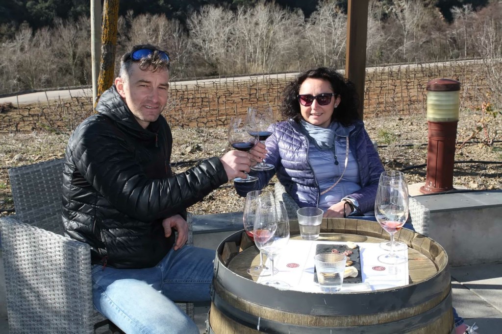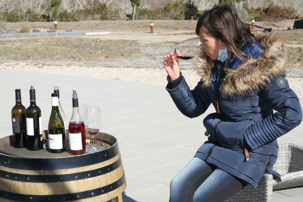 Por último, en el jardín, en un enclave mágico, fondo único de naturaleza salvaje, debajo un porche de madera con unas originales mesas hechas con barricas, con una mañana soleada que acompañaba, realizamos la cata de cuatro vinos, un viaje de descubrimientos y sabores del placer de los vinos Perinet, artesanales y de excelencia, elaborados 100% en origen. Carlota con sus conocimientos pues tiene un master de sommelier, su profesionalidad y la pasión que le pone por lo que hace, hizo que la cata fuera muy especial y diferente a otras, muy buena y con detalle, perfecta, hizo que con cada vino que probábamos, en nariz, encontramos notas de fruta roja madura, roble francés con carácter