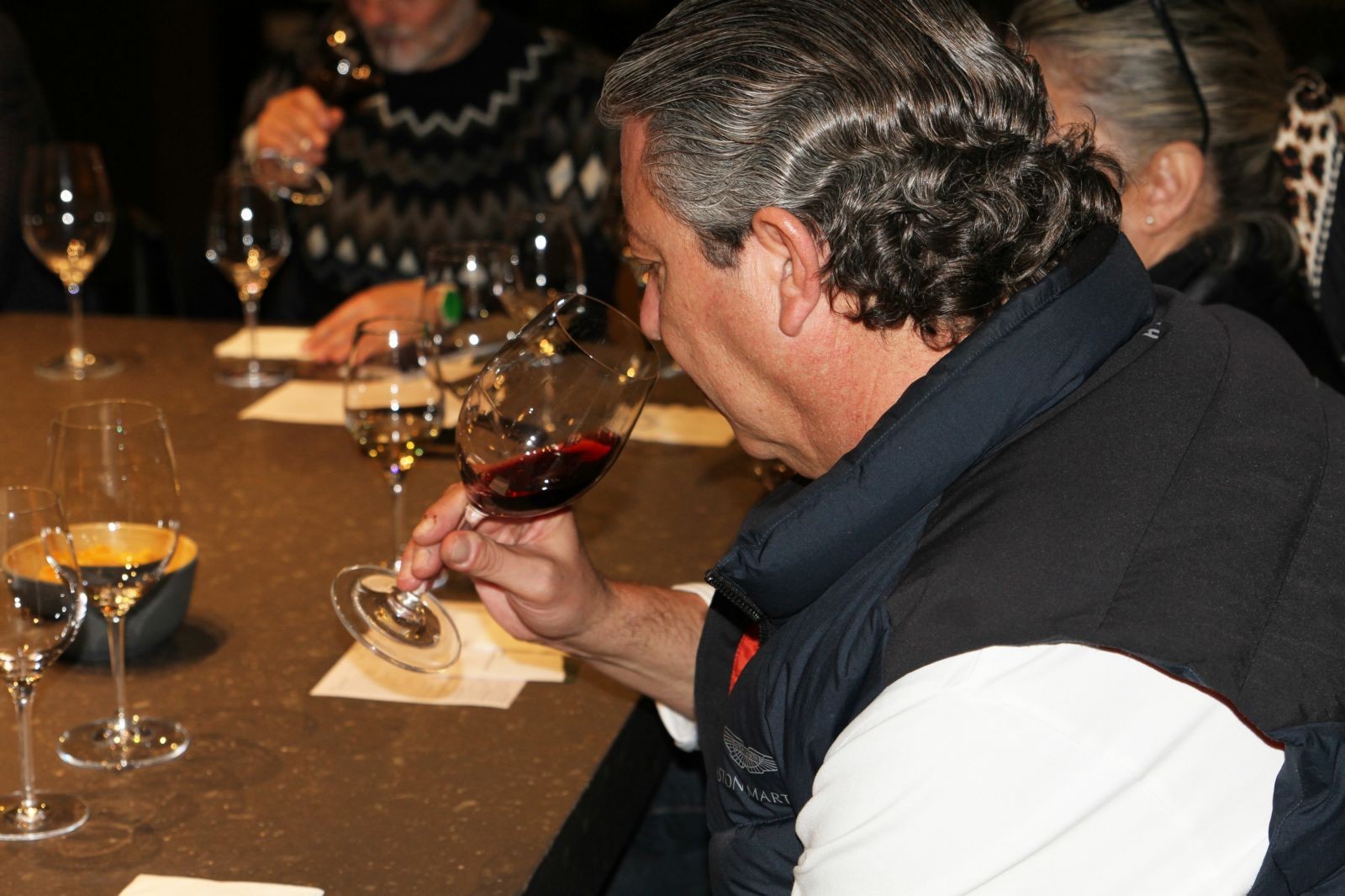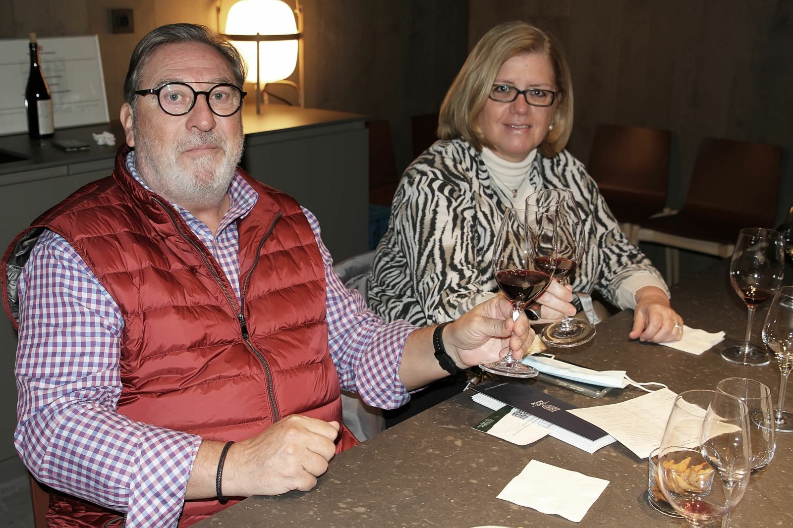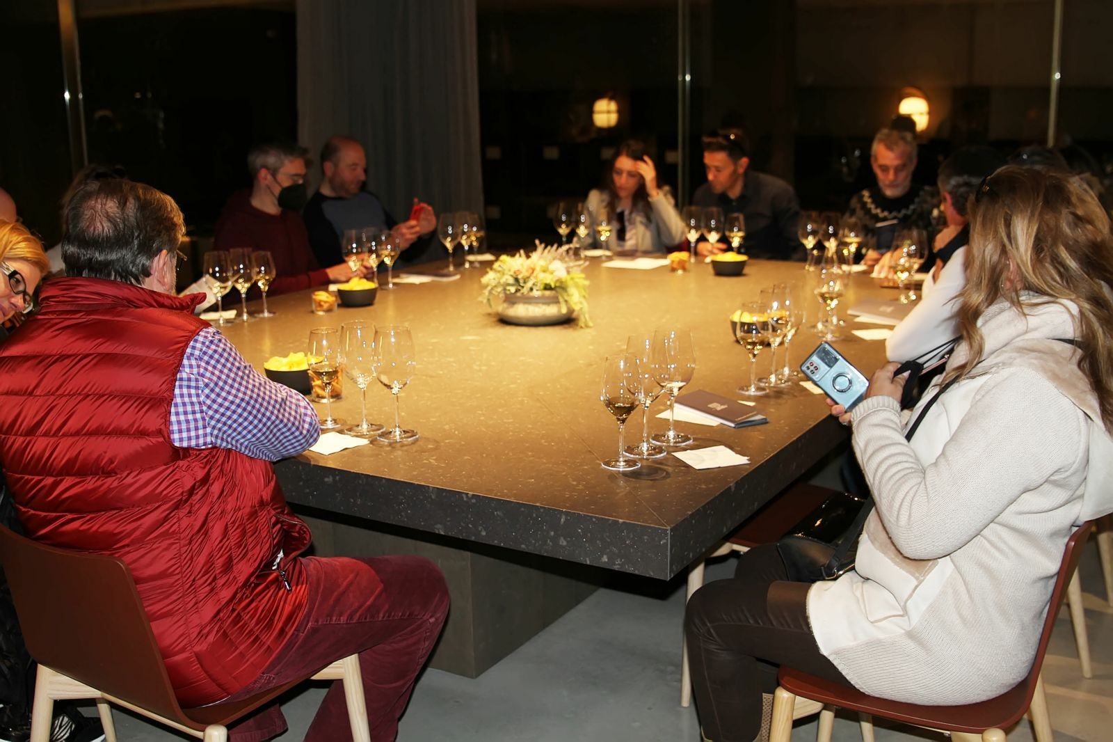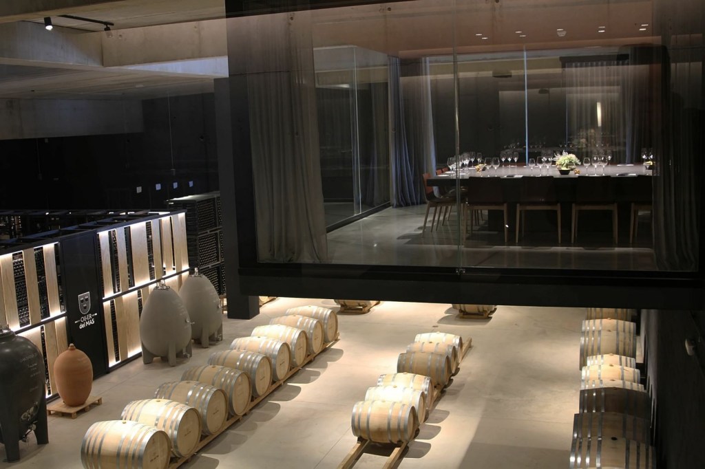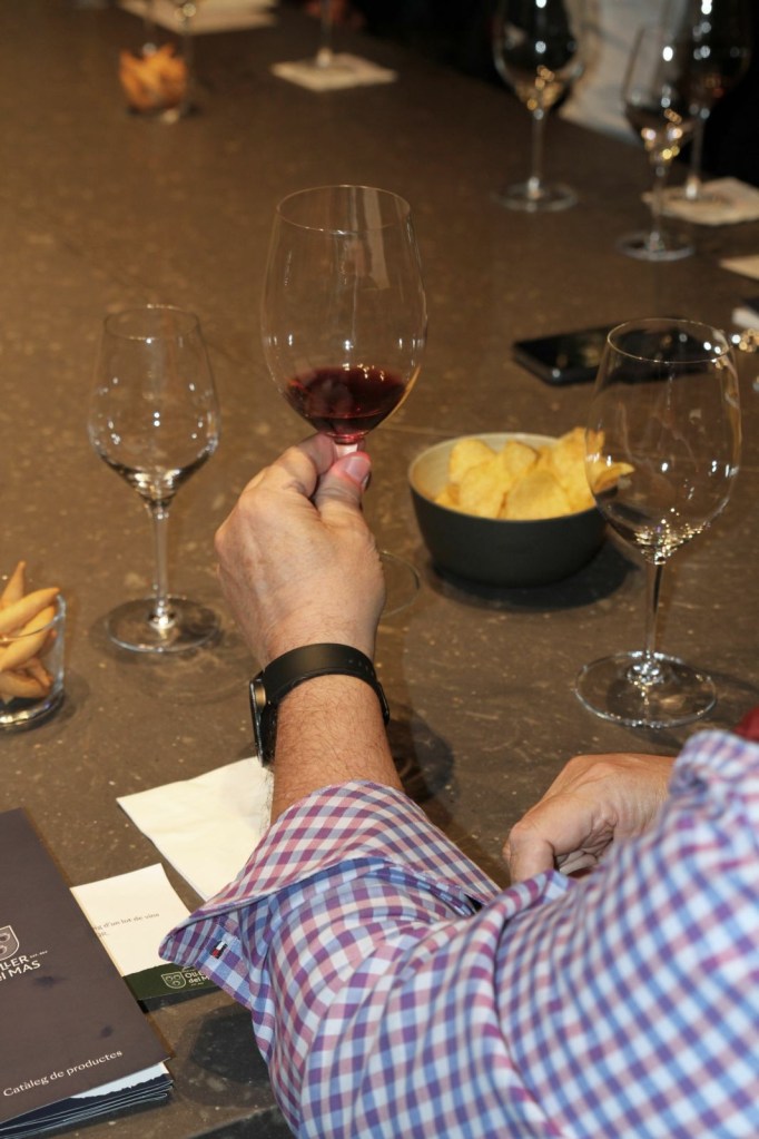 Realitzem el tast en una agradable, moderna i minimalista estada, ubicada a la planta superior de la boutique, des de la qual, a través d’una vidriera, com un gran aparador, es visualitza la part de sota de la mateixa on es troba la flamant i innovadora sala de bótes, espectacular, veure-la des d’aquesta perspectiva, amb una llum tènue i en la que entre les mateixes i amb un actual i modern disseny s’observa el que s’anomena el cementiri de les ampolles, ampolles amb molta antiguitat i de diferents i velles anyades, emmagatzemades reposant-hi .