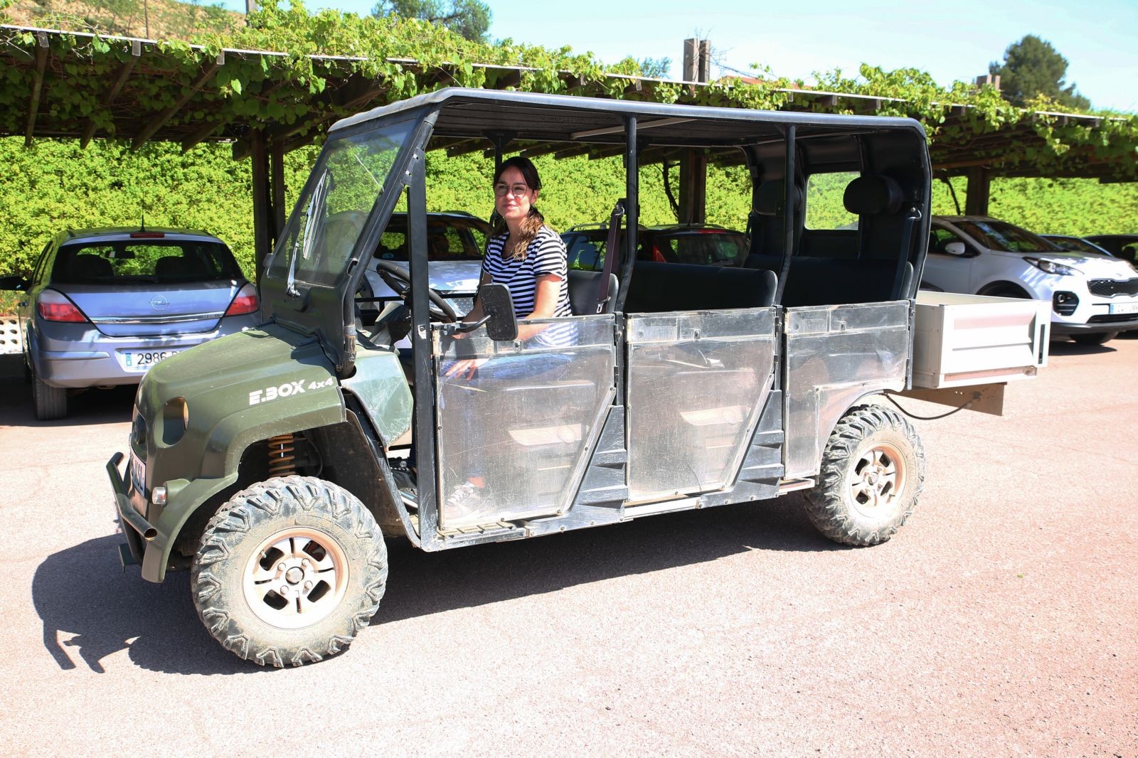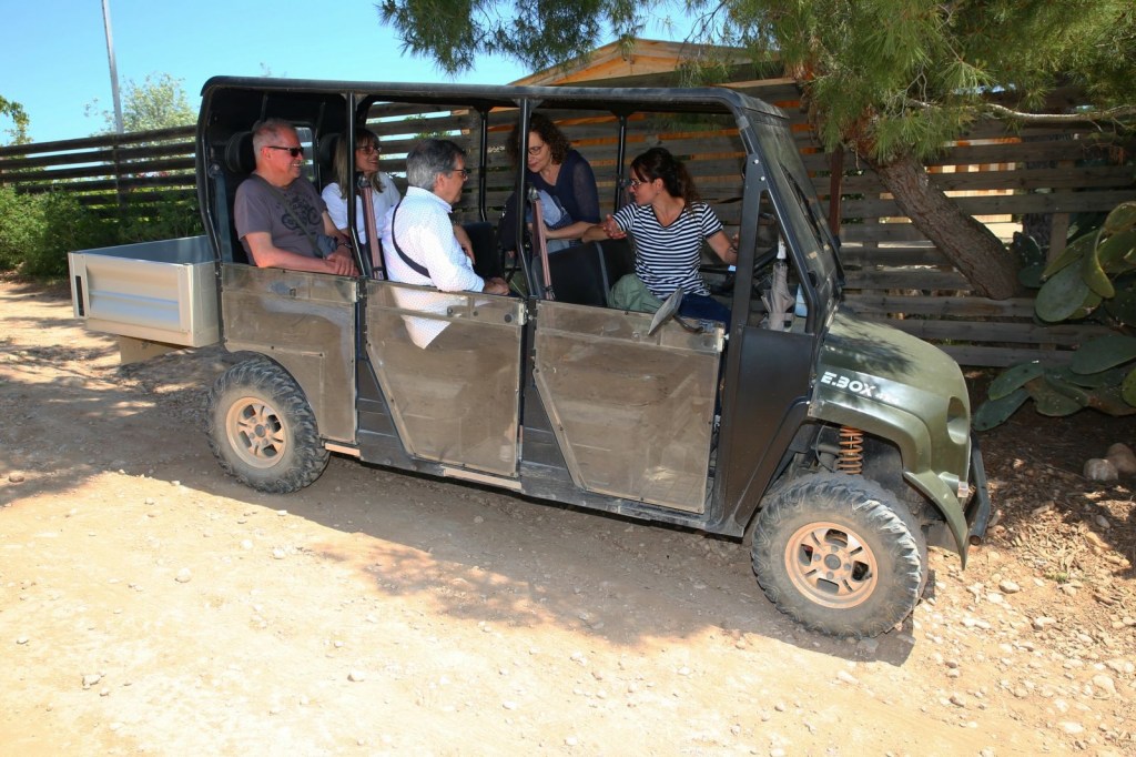 On deixem la furgoneta i en un cotxe elèctric molt peculiar (no us podeu perdre aquesta experiència) entre vinyes ens traslladem a la Granja Enmig de les vinyes,