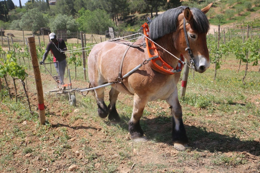 Mireia ens explico la importació dels cavalls que tenen a la granja, on vam tenir l’oportunitat de veure com s’arava la terra a tracció animal com antigament .El cavall permet llaurar la terra sense compactar-la, afavorint-ne el drenatge de les aigües, la proliferació de les arrels i la seva capacitat d’arribar fins a la roca mare, però potser el més important és el fet que obliga al viticultor a aproximar-se a la terra, sentir-la, olorar-la, observar-la. El fet de caminar-la i trepitjar-la permet estar atent al que li passa a la vinya i als que hi viuen, és una comunicació directa i de gran transcendència.