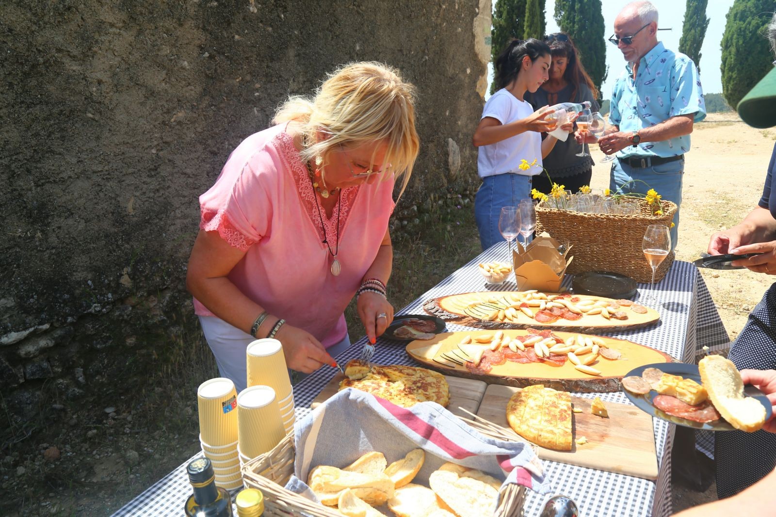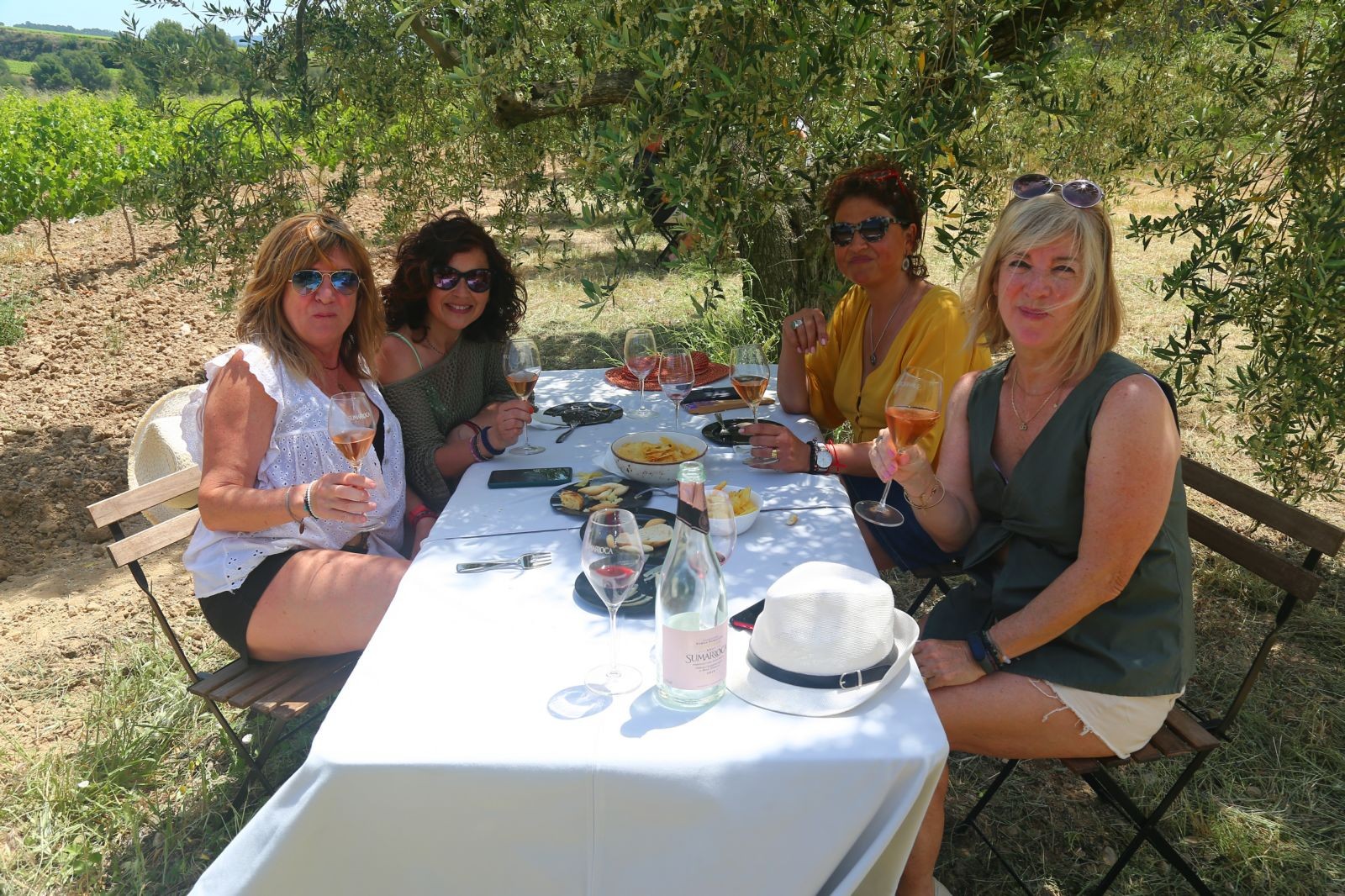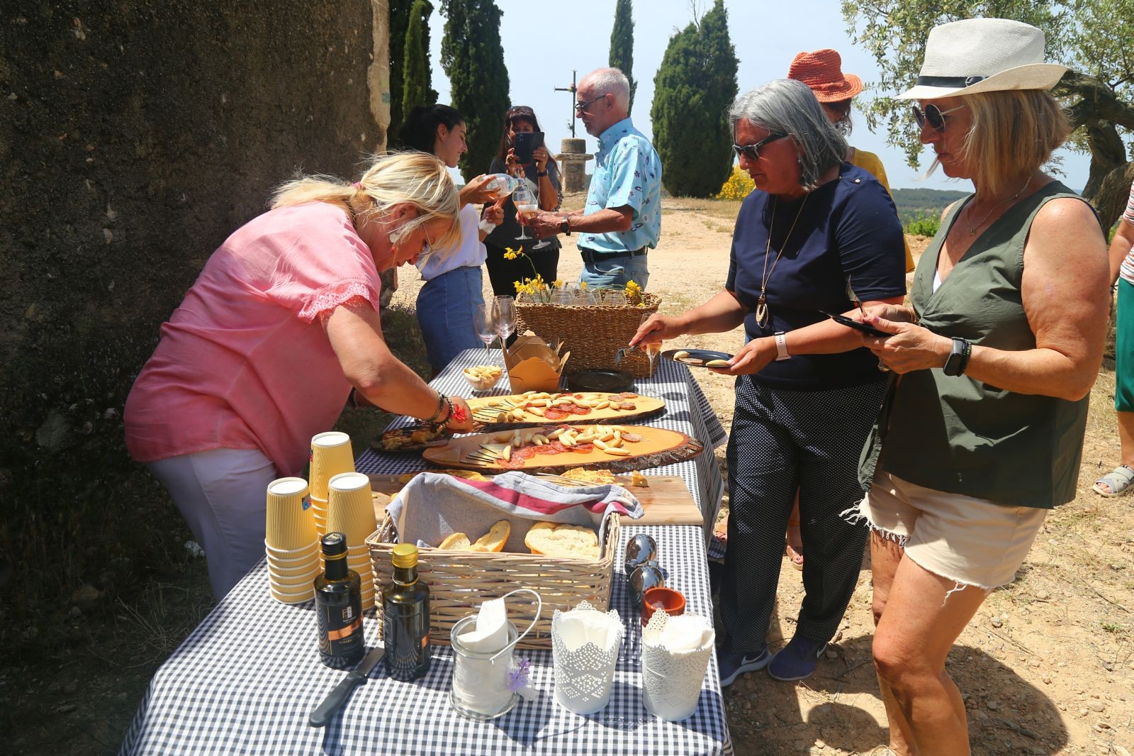 Aquí, al costat de l´Església de Santa Creu de Creixà, en una zona plena d´oliveres, havien col·locades unes taules i cadires de fusta, sota les oliveres i música de fons, vam acabar amb un gran aperitiu i amb els esplèndids vins o caves Sumarroca