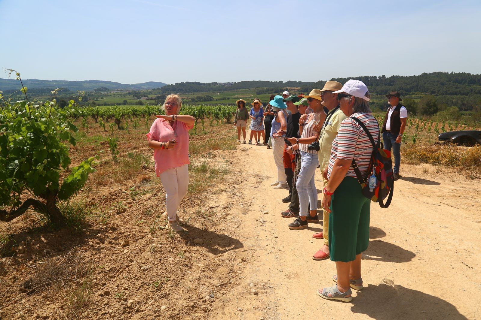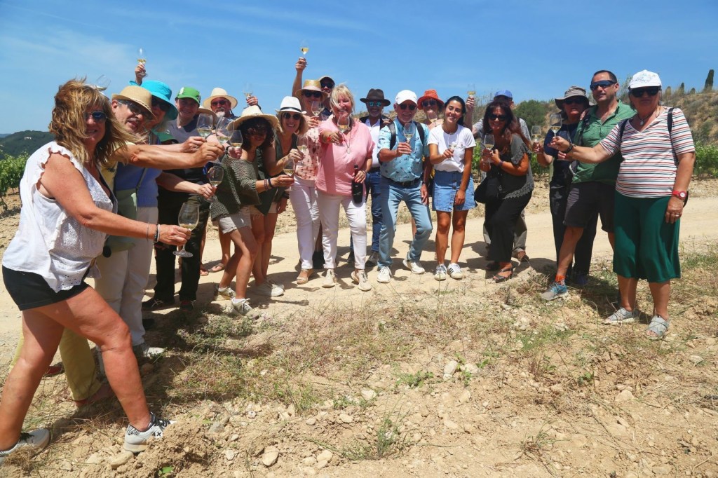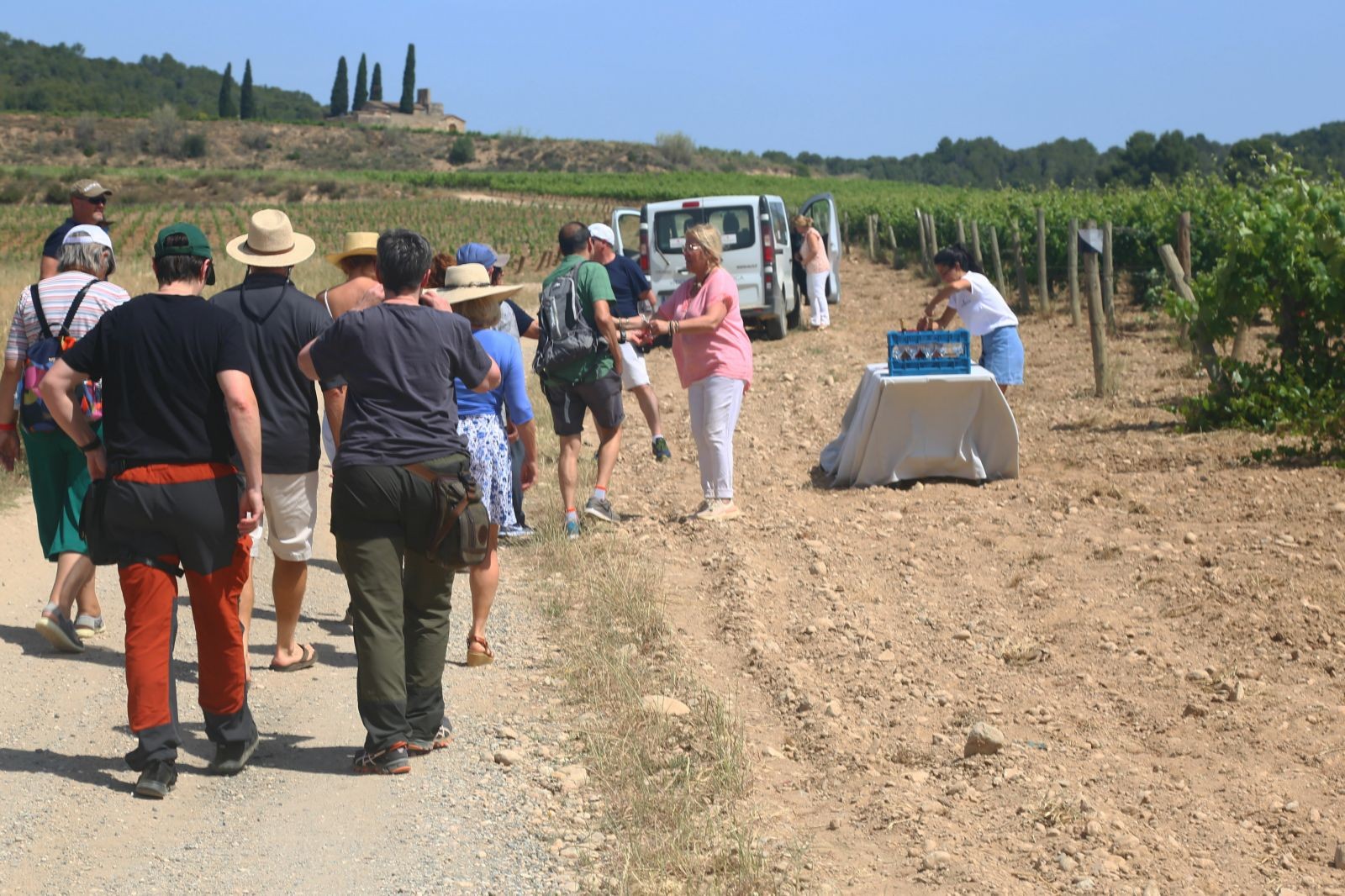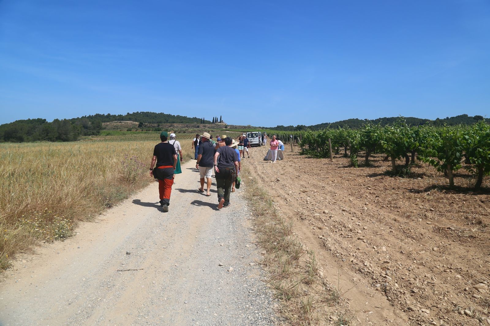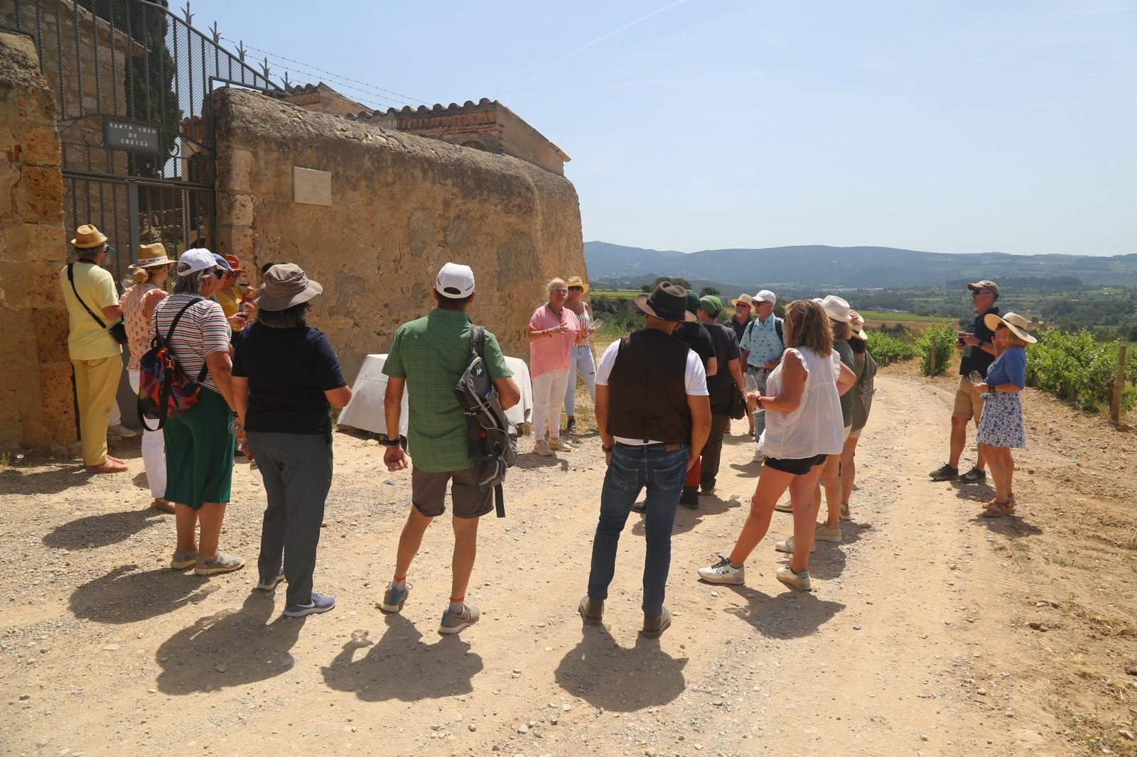 Aquesta vegada, no vam anar als cellers, la Mercè ens va concentrar a tots a la finca SUMARROCA, a Monistrol d’Anoia, des d’on partim amb els cotxes fins a la primera parcel·la, on els vam deixar aparcats i des d’allà, ja seguim caminant entre vinyes on vam poder veure la seva brotació i en cadascuna provaríem els vins o caves que s’elaboren de la varietat plantada, fins arribar a l’última, a l’Església de Santa Creu de Creixà.