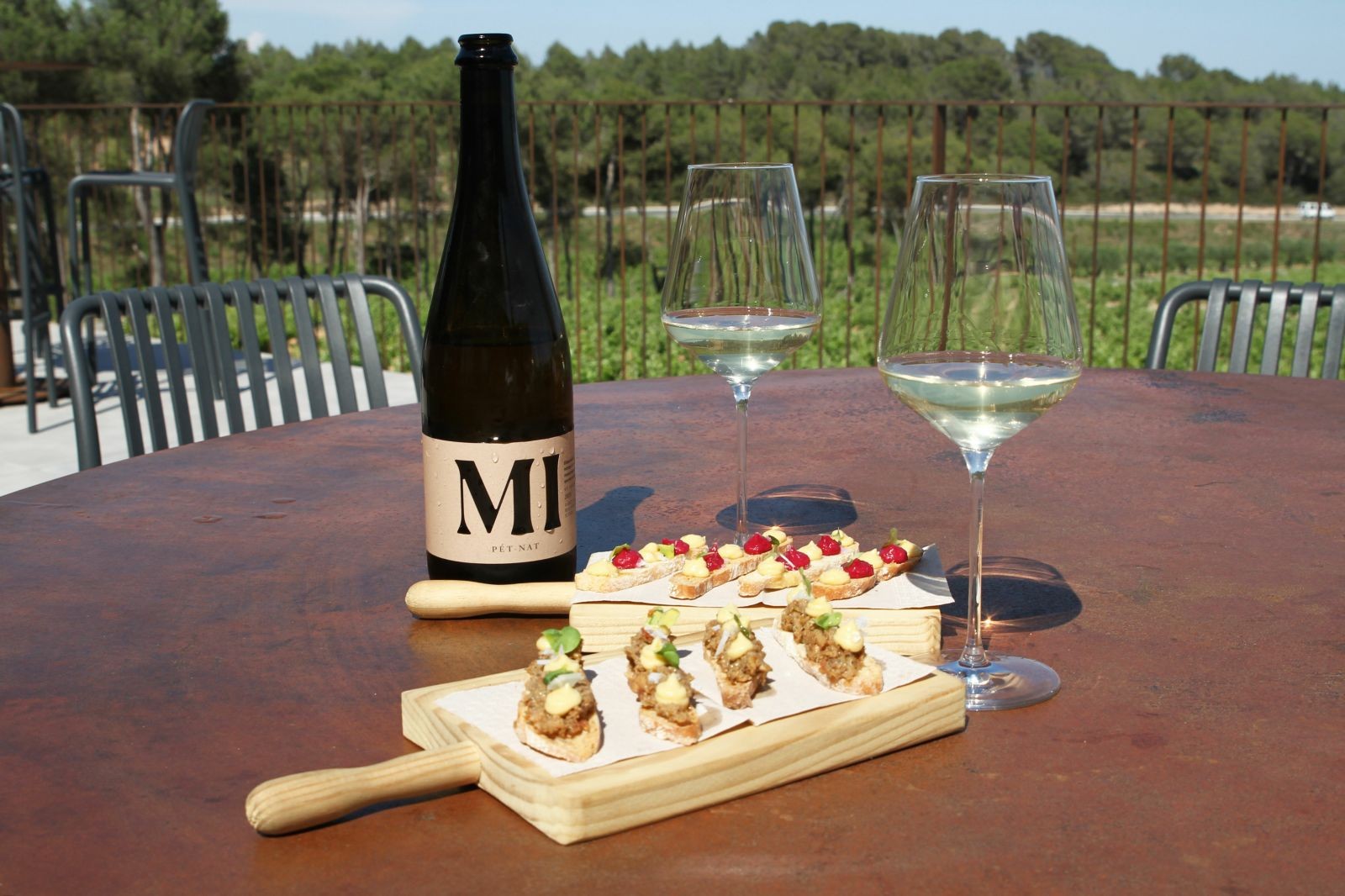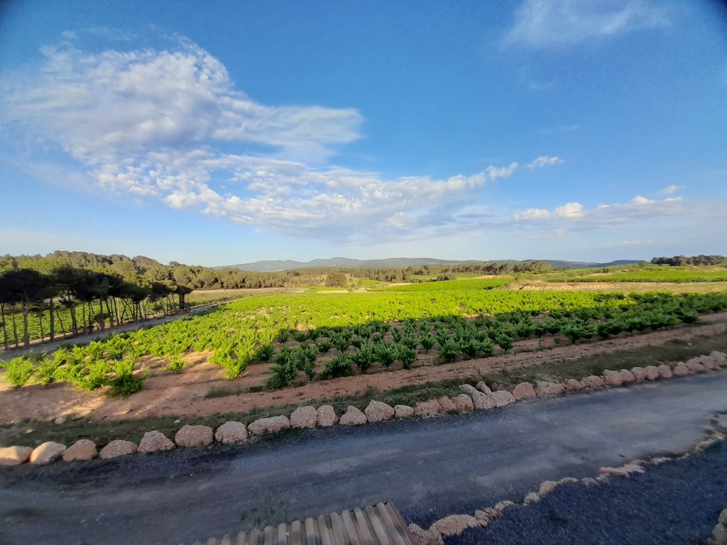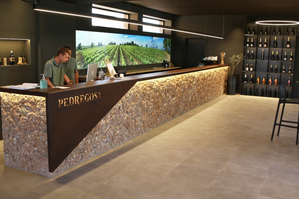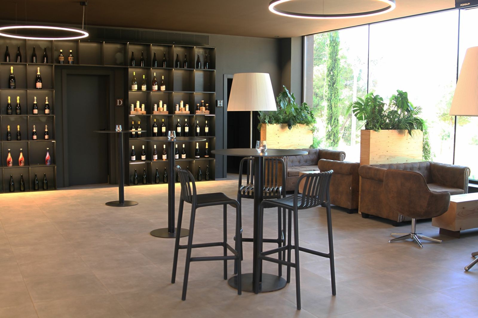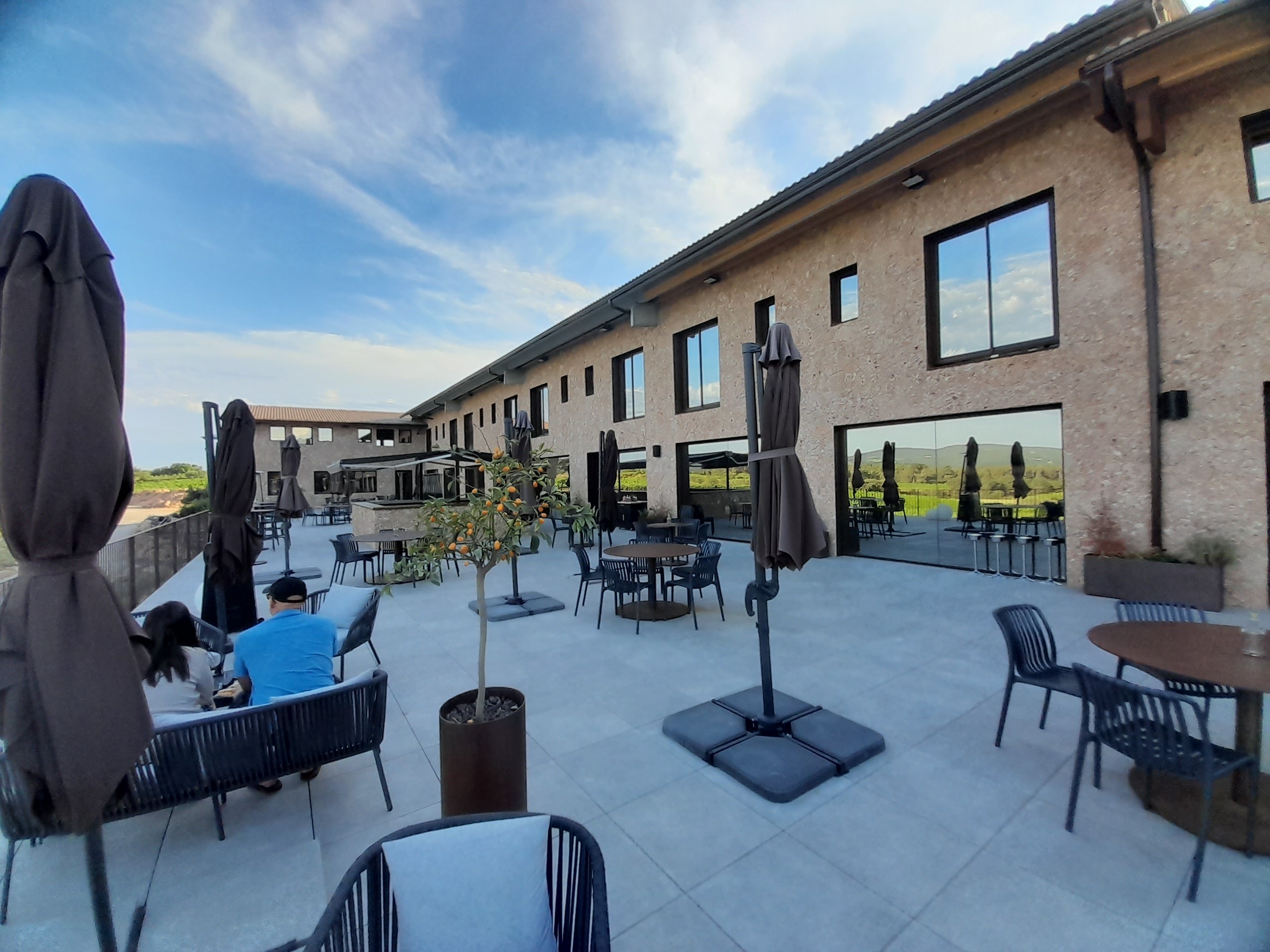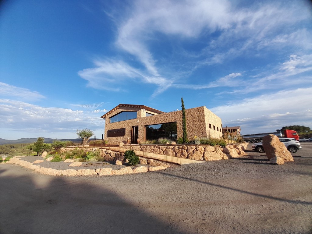 Només arribar ens va impactar el paisatge obert, sense portes ni tanques, i al fons, al capdamunt, el celler, impressionant, actual i modern, però , integrat a l’entorn, amb parets de pedres tretes del mateix terreny que envolten les vinyes, una meravella,. L’entrada és imponent, gran i diàfana, majestuosa, que serveix de botiga i extensió del wine bar que hi ha en una enorme i magnífica terrassa, amb unes imponents vistes on predominen i són les protagonistes les vinyes i petites motes de boscos, i aquí en aquest meravellós lloc comencem la visita, lloc on a més de poder prendre una explendida copa de vi o cava dels exquisits i qualitat que tenen, també pots menjar unes espectaculars tapes casolanes de temporada i proximitat