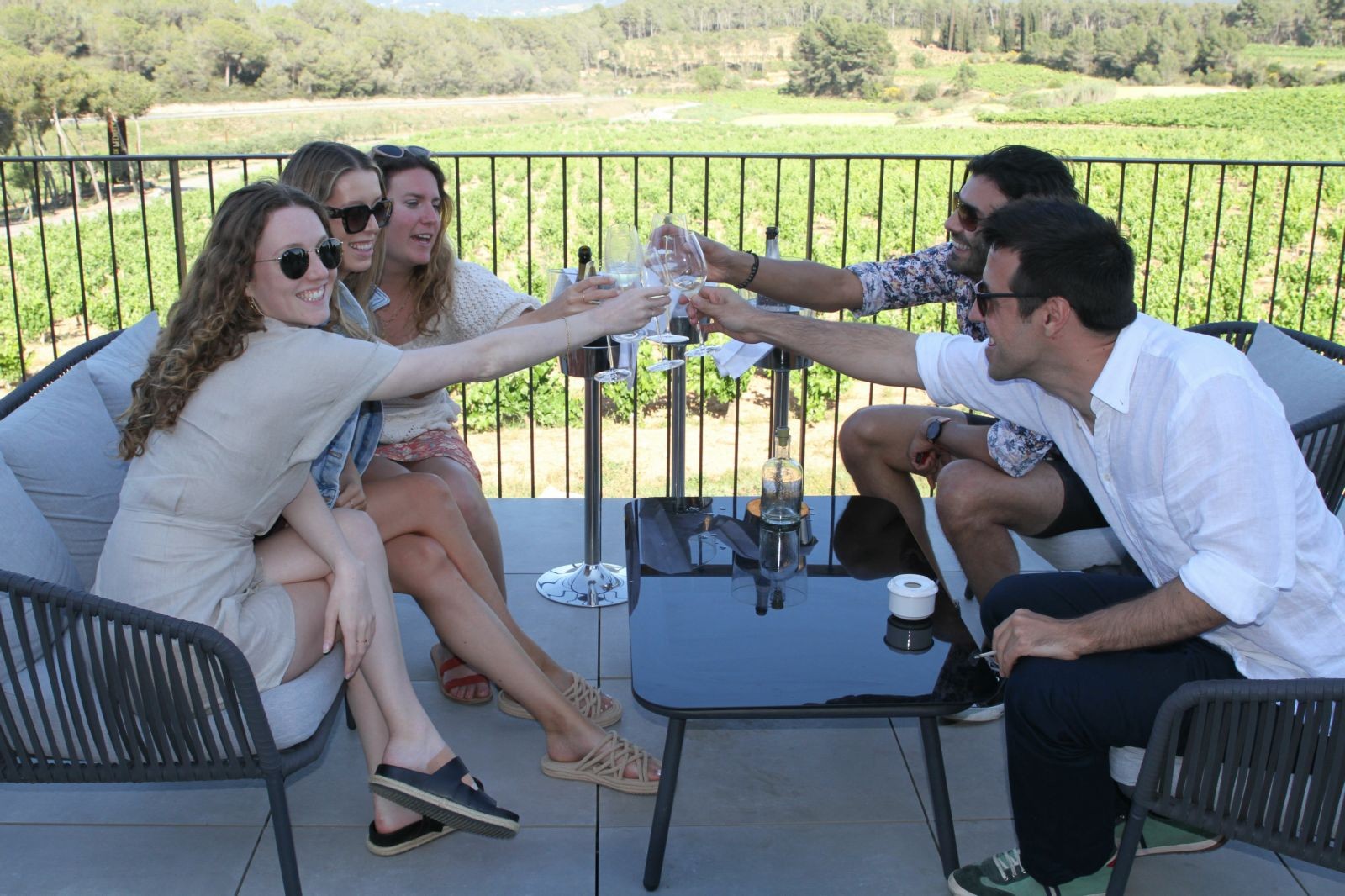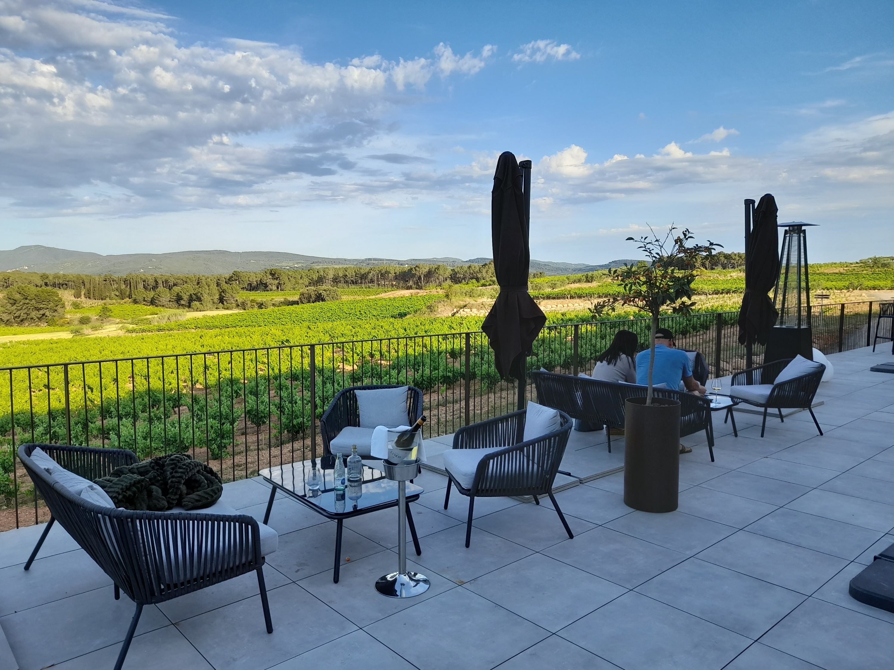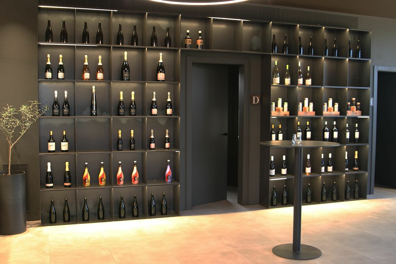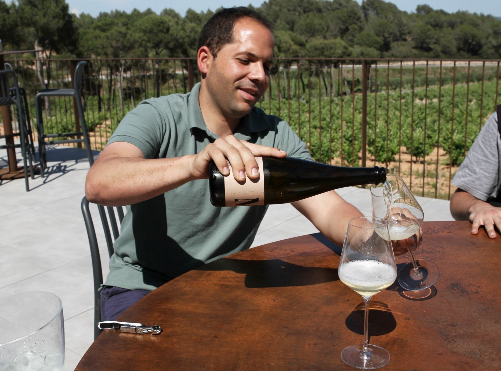 Només arribar ens va impactar el paisatge obert, sense portes ni tanques, i al fons, al capdamunt, el celler, impressionant, actual i modern, però , integrat a l’entorn, amb parets de pedres tretes del mateix terreny que envolten les vinyes, una meravella,. L’entrada és imponent, gran i diàfana, majestuosa, que serveix de botiga i extensió del wine bar que hi ha en una enorme i magnífica terrassa, amb unes imponents vistes on predominen i són les protagonistes les vinyes i petites motes de boscos, i aquí en aquest meravellós lloc comencem la visita, lloc on a més de poder prendre una explendida copa de vi o cava dels exquisits i qualitat que tenen, també pots menjar unes espectaculars tapes casolanes de temporada i proximitat