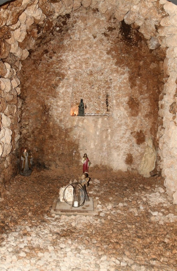 En aquesta mena de cova la Mª Carmen ha posat, en un petit pedestal fet a la mateixa roca, la Mare de Déu de Montserrat, la Moreneta , ia la qual si vols, hi pots posar una espelma, com a l’Abadia de Montserrat, entre nosaltres jo en vaig posar dos, és un lloc diferent i sorprenent, però que val la pena visitar