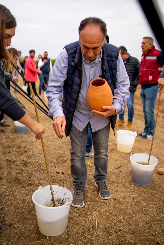 Otro de los preparados es el de Maria Thun, que los asistentes pudieron ayudar a dinamizar (nombre que recibe la aplicación de energía en estos compuestos) y aplicar en los propios viñedos de Finca Los Hoyales. Elaborado con agua, estiércol de vaca, cáscara de huevo y basalto, se utiliza para aumentar la fertilidad del suelo y contrarrestar las impurezas que pueda tener.