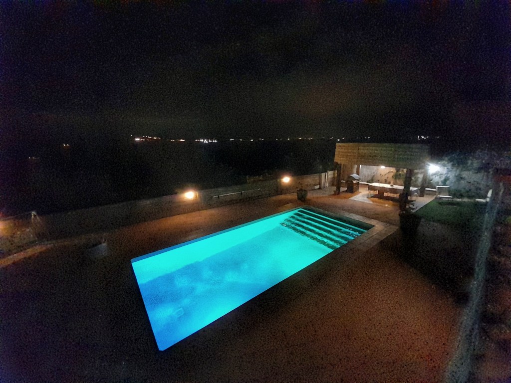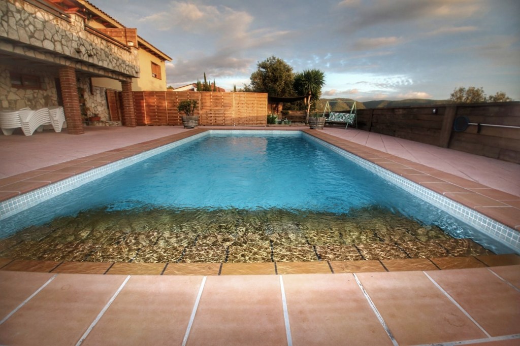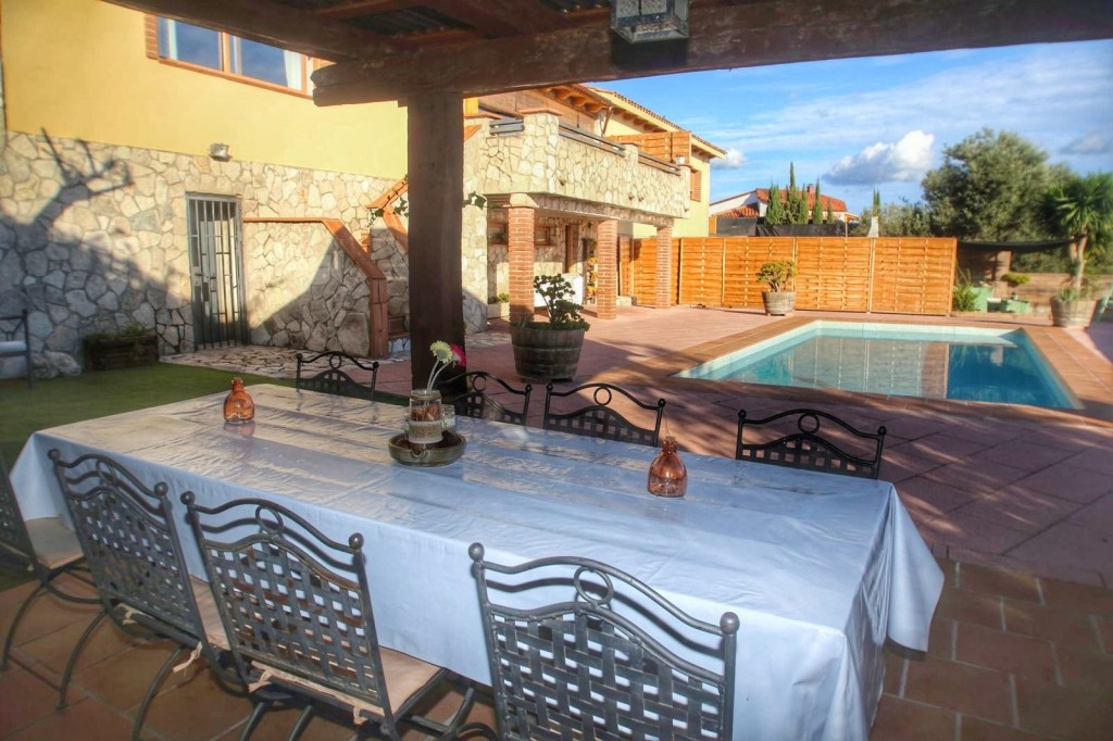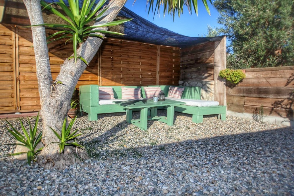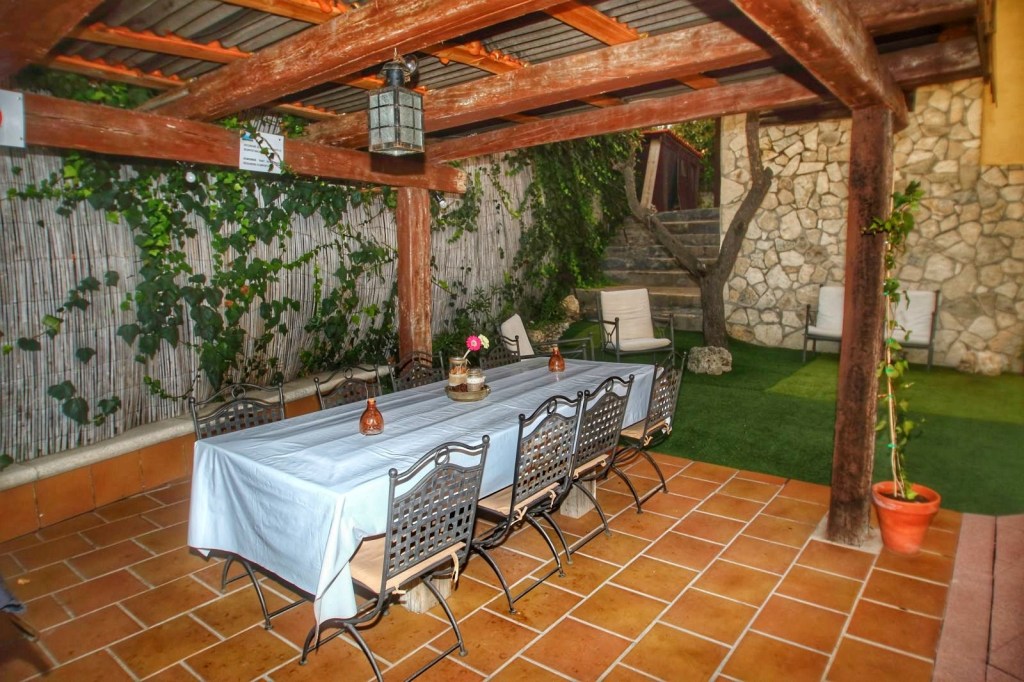 Bajamos al jardín y allí ya si que se paró el tiempo, una magnifica piscina, una zona de césped, con un porche dispuesto con una gran mesa y una barbacoa y en un rincón unos sillones acondicionados para un tertulia, café, para lo que te apetezca y si esto no fuera poco, hay otro ambiente habilitado como chill out, que nosotros deleitamos tomando el café después de comer.