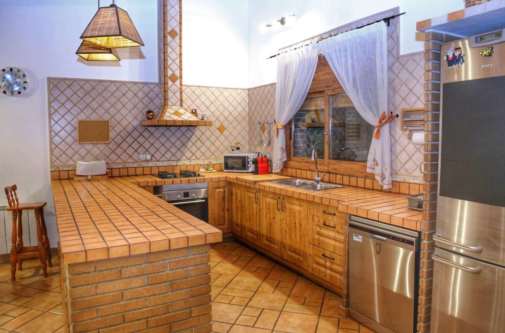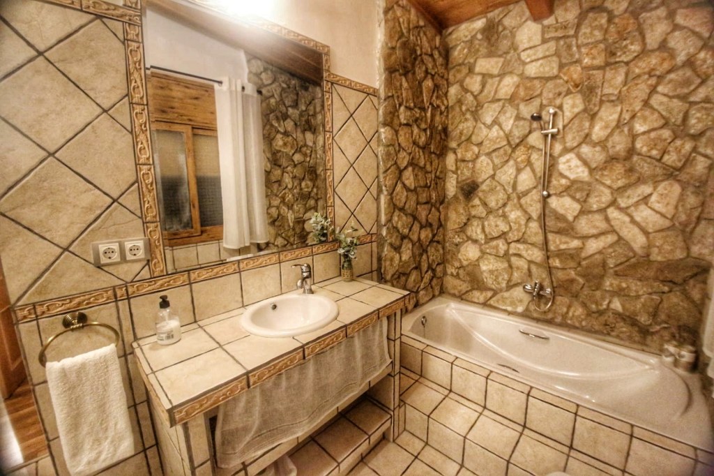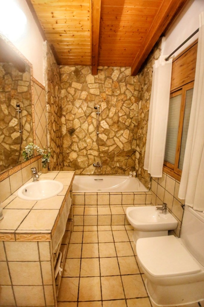 Seguimos recorriendo las estancias, como las 3 habitaciones y un bonito baño y la suite con baño propio, un baño con ducha y bañera, una bañera que está rodeada de pared de piedra, dándole un encanto especial al baño, y esta es le la que nos o nos alojamos nosotros, y de la que al día siguiente nos costó levantarnos y no queríamos dejar, ni la habitación ni la casa, era todo tan placentero. Posteriormente visitamos la cocina, una gran y fantástica cocina, que no le falta detalle