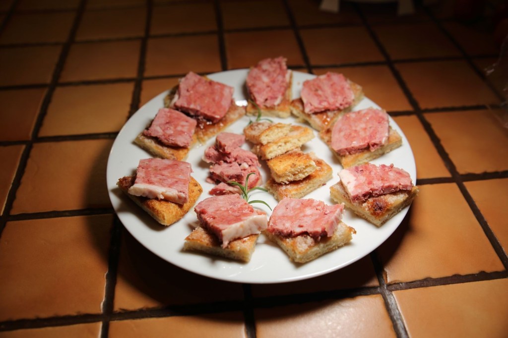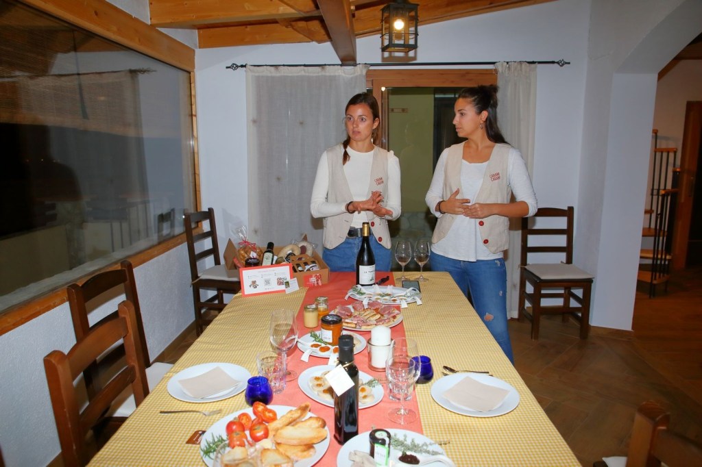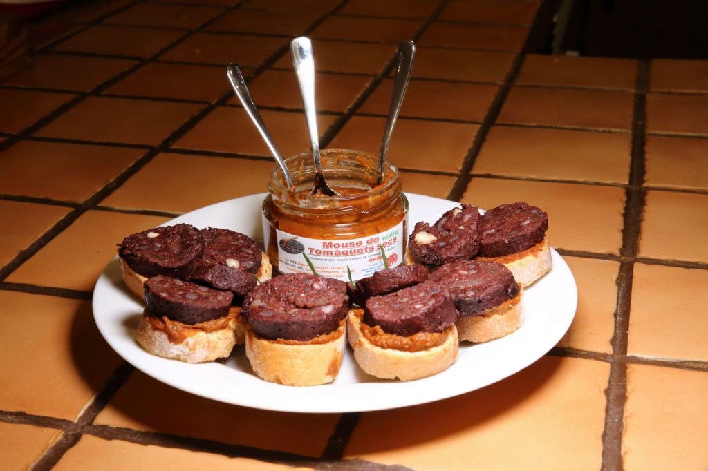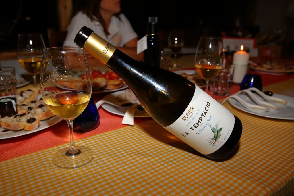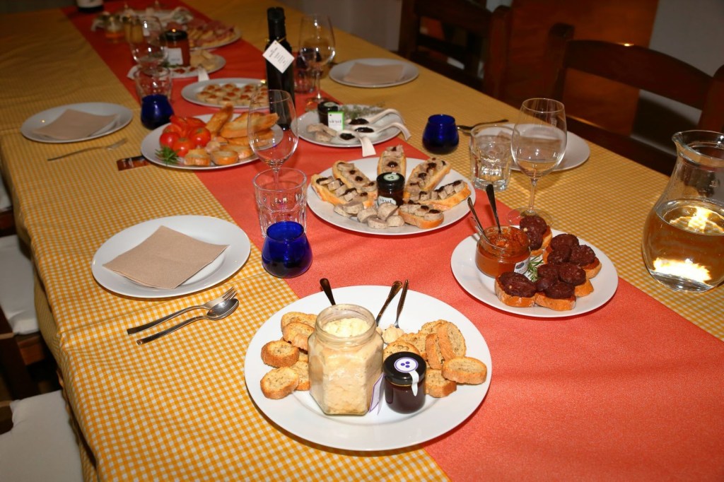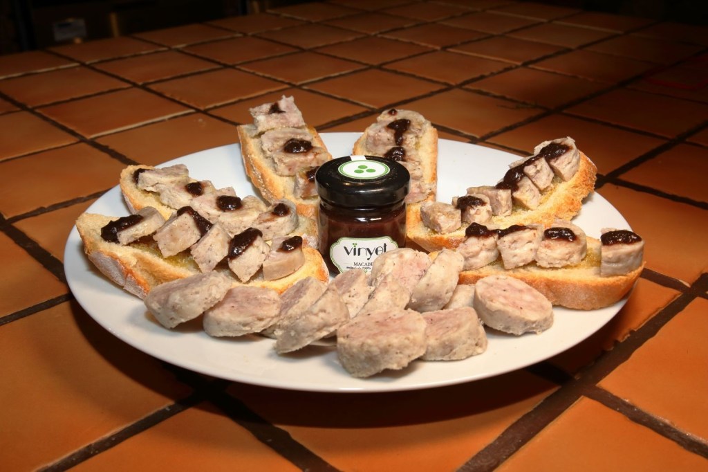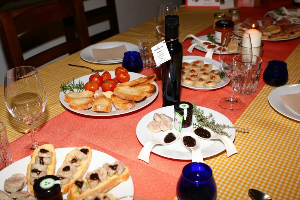 La experiencia se llama “Tast Subirats tot l’any “, la cena fue con productos de Subirats, pasando por las 4 estaciones del año. Antes empezar la experiencia, nos dieron una explicación de su proyecto y de los que íbamos a catar, de su lugar de procedencia. y como. Los platos, que ocupaban toda la mesa y mira que era grande, no estaban puestos al azar, todo tenia un sentido, ya que como la experiencia a realizar “Tast Subirats tot l’any “, estaban colocados por la estaciones del año, empezando por la Primavera, catando miel, coca de chicharrones y pan de hígado, para pasar al Verano con mermelada de melocotón del Ordal “las Filos”, botifarra de Huevo con chips y cebolla con un toque de mermelada de melocotón del Ordal, luego fuimos al Otoño con una mermelada de uva, con butifarra blanca y ésta misma botifarra con unas tostadas y un toque de mermelada de uva de Xarel-lo, asimismo hicimos una cata de aceite virgen de tres variedades .Por ultimo llegamos al Invierno con conserva de mus de tomate, con rucula, ajo, perejil y aceite de oliva, se llama Set pos, marinamos con un butifarron negro, de cebolla y piñones y pan con tomate.