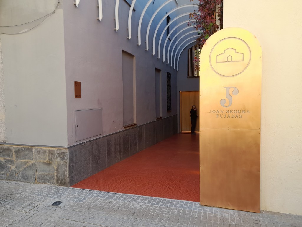 Hi ha un espai al celler que estan unides l’antiguitat amb la modernitat, ja que hi ha una part del celler d’antany, de l’inici on gairebé no pots passar i que et transporta al passat, compartint amb una altra part moderna, però que en conjunt fa del lloc un encant. D’aquí vam passar a una sala on vam poder veure un bonic i especific vídeo del que és i representa JOAN SEGURA PUJADAS.