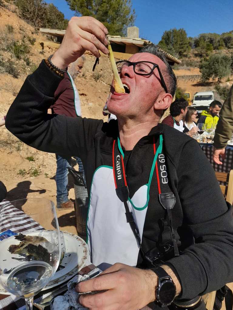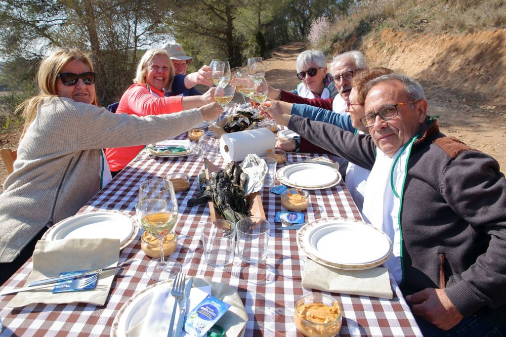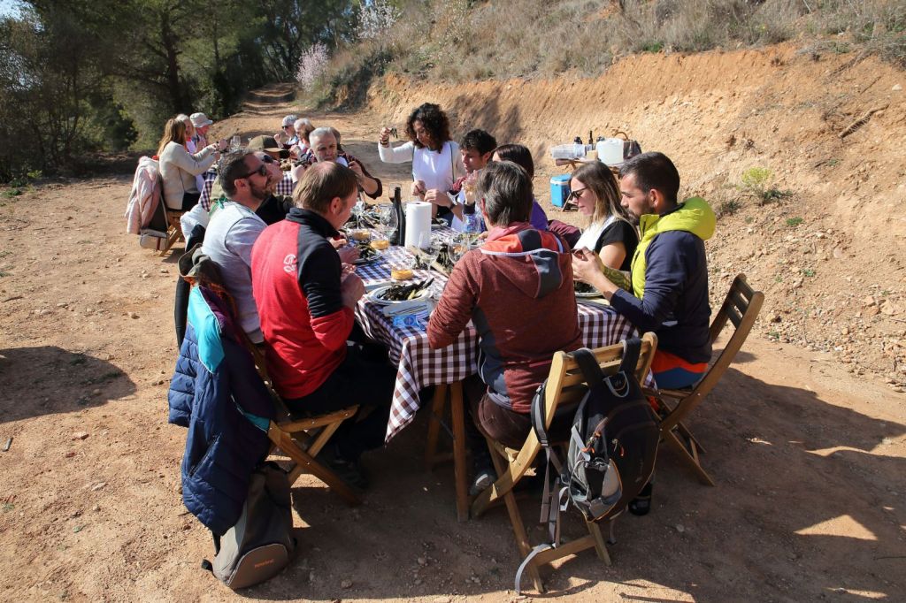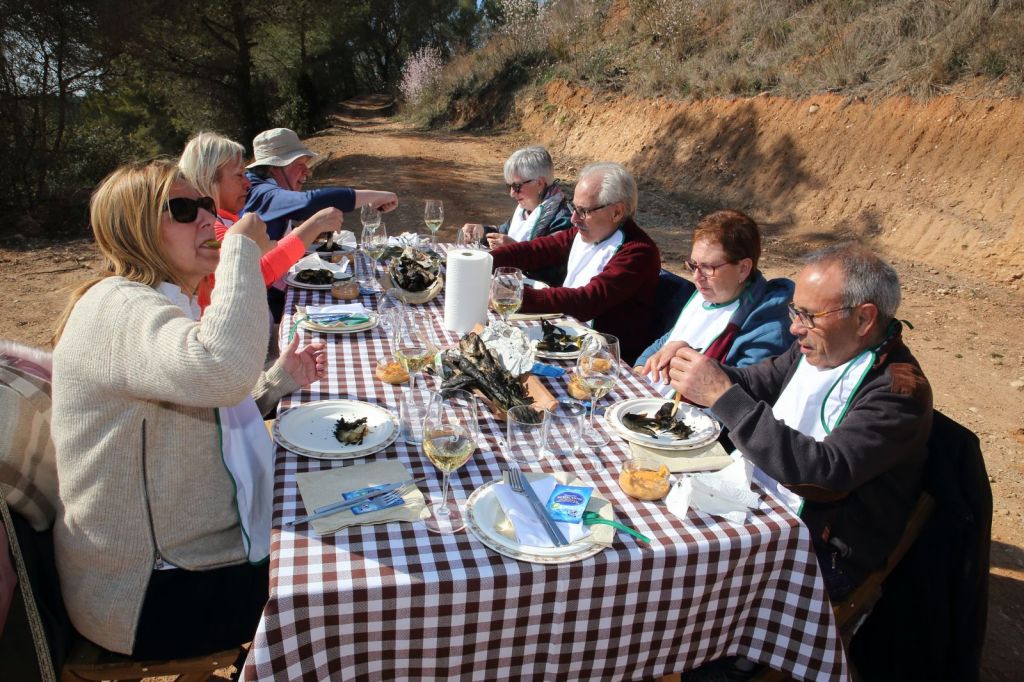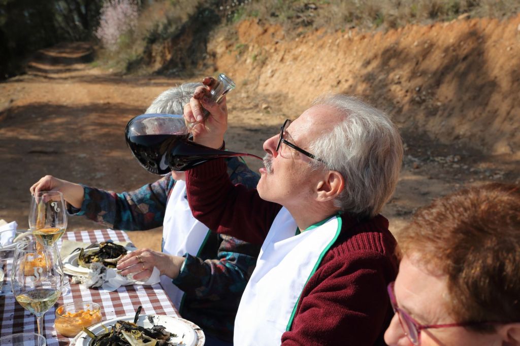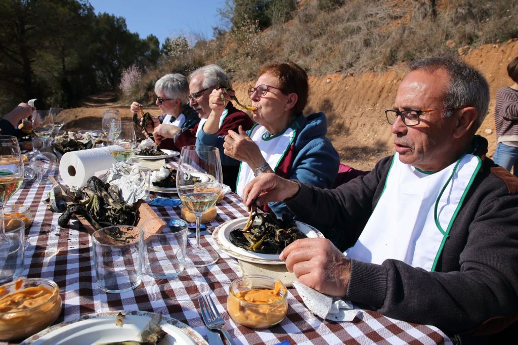 En un entorn envejable, on havien preparat dues taules, ens van començar a servir, en unes teules, els típics calçots, que no paraven d’omplir-les així que s’anaven acabant, amb una espectacular i saboríssima salsa, feta per la Teresa a la que tots vam felicitar