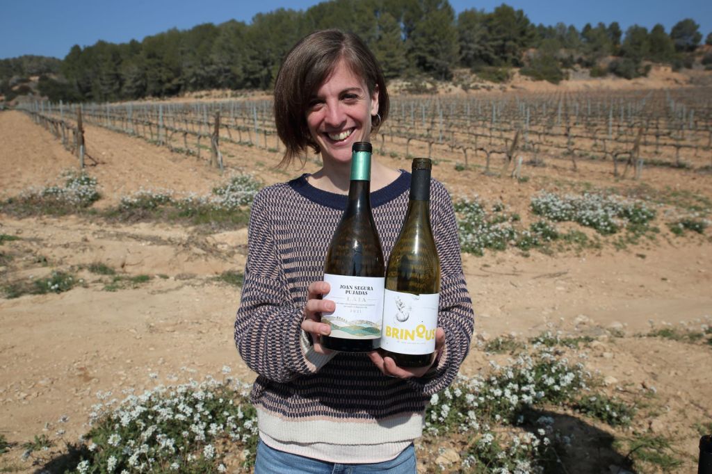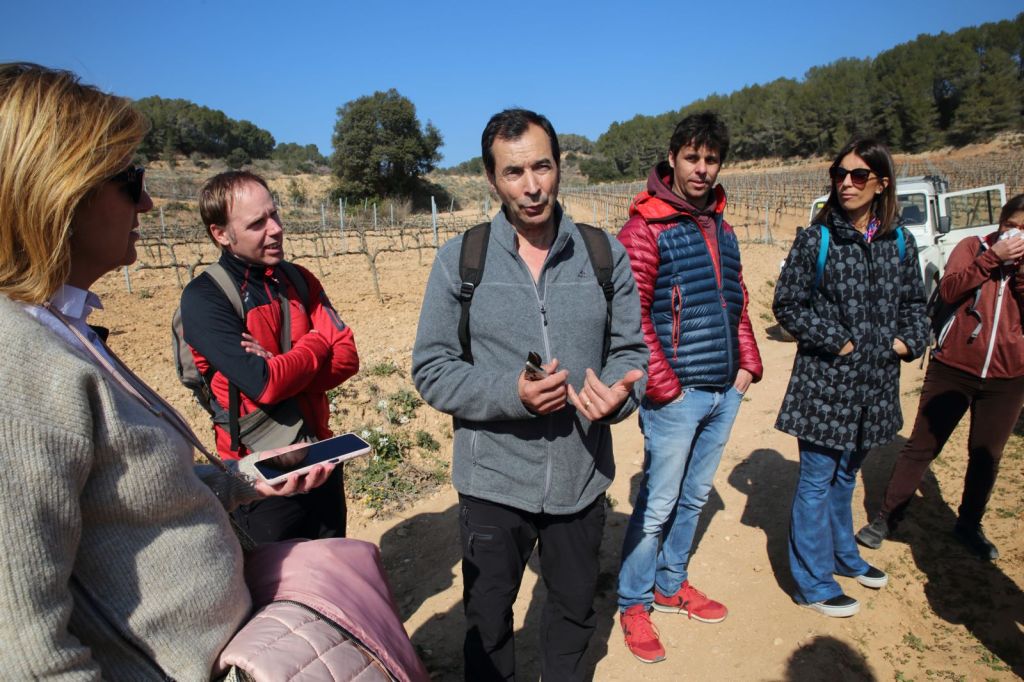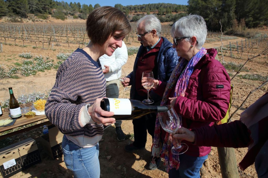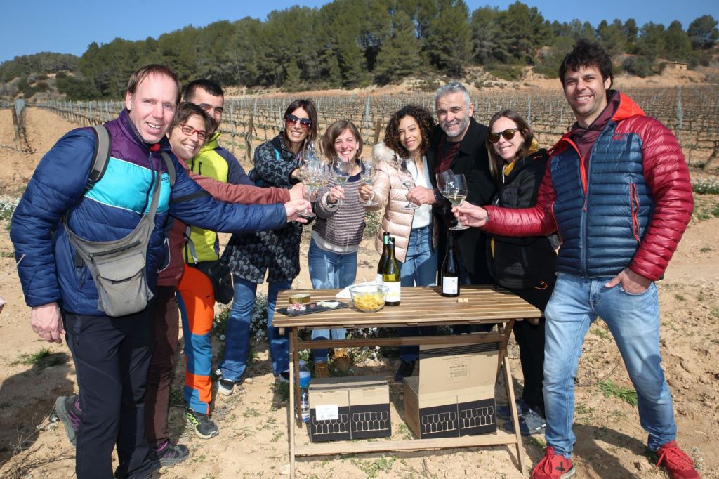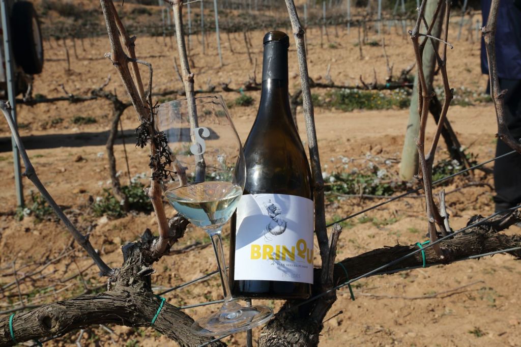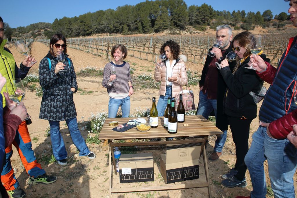 Arribem a unes de moltes de les vinyes que tenen, aquesta, on ens parem, és de macabeu, i aquí s’uneix al grup la Georgina, l’encarregada d’enoturisme, una jove encantadora, que entre el camí i un tros de la vinya, ens té preparada una taula amb dos vins blancs fresquets, amb un pica pica , uns vins fantàstics, els Brinqus Blanc i Laia Blanc
