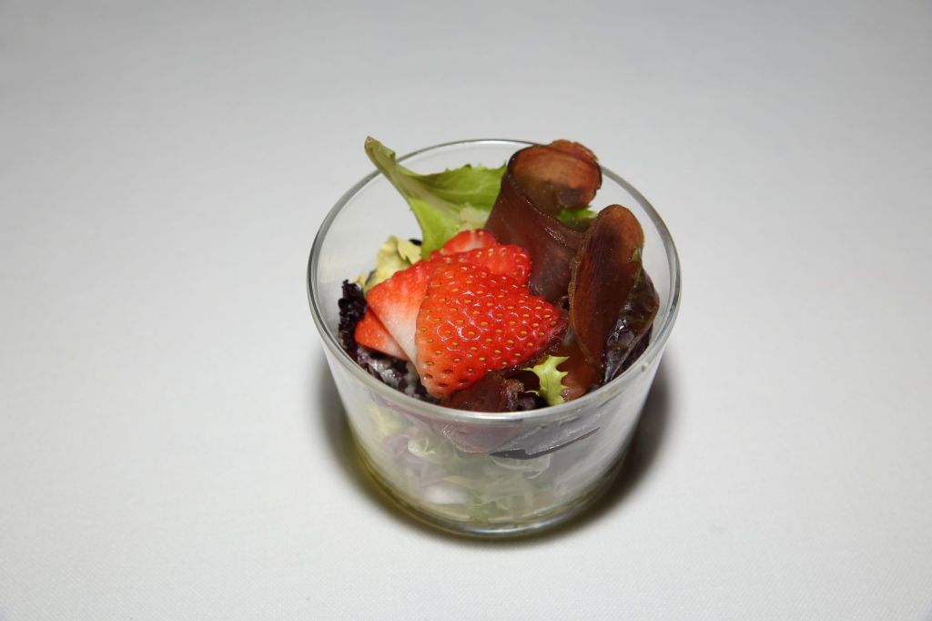 en primer lloc una ensalada de maduixes, mojama i parmesa