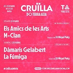 Un cop finalitzada la mostra, arrencarà un dels esdeveniments més esperats d’aquesta Primavera DO Terra Alta: la celebració de la primera edició del festival Cruïlla DO Terra Alta, que omplirà la comarca de música per a tots els públics, amb un cartell de luxe que inclou les actuacions de MClan i Els Amics de les Arts, dissabte al vespre; i La Fúmiga i Dàmaris Gelabert per als més petits, el matí de diumenge.
