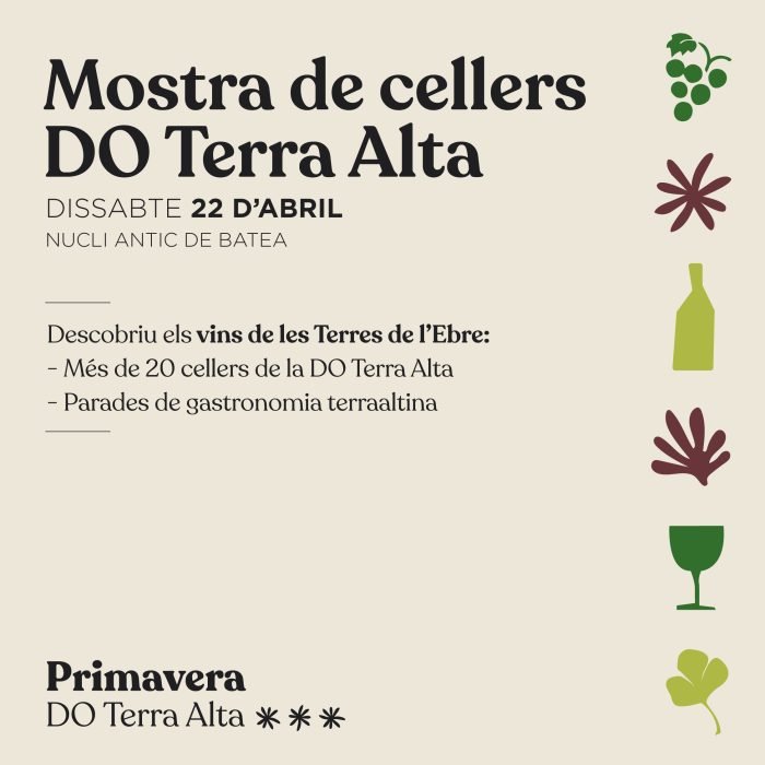 La Denominació d’Origen Terra Alta organitza el pròxim dissabte 22 d’abril una nova edició de la seva Mostra de vins. Serà al nucli antic de Batea, en el marc de les accions de la Primavera DO Terra Alta. Al llarg de tot el dia, els assistents podran gaudir d’una àmplia gamma de vins que aniran des de les tradicionals garnatxes blanques fins als vins joves d’aquesta anyada, passant pels vins premiats en l’edició del Concurs de Vins amb DO Terra Alta, que s’haurà celebrat aquella mateixa setmana durant el sopar del 40è aniversari de la DO.