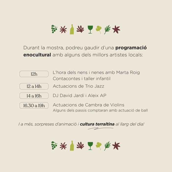 Pel que fa a les propostes culturals, arrencaran a les 12h amb contacontes i tallers per als més petits, així com actuacions musicals que s’allargaran fins a les 14h. En horari de migdia, aquells que vulguin quedar-se a la fira maridant els vins de la DO Terra Alta amb les diferents propostes gastronòmiques, podran fer-ho acompanyats de la música dels Dj David Jardí i Aleix AP.