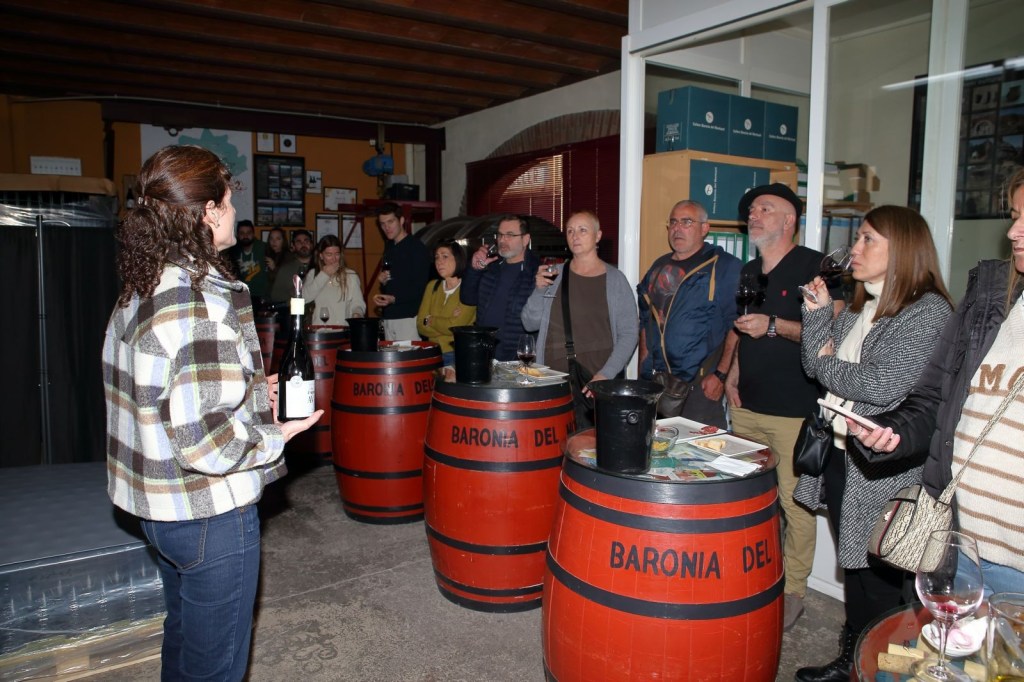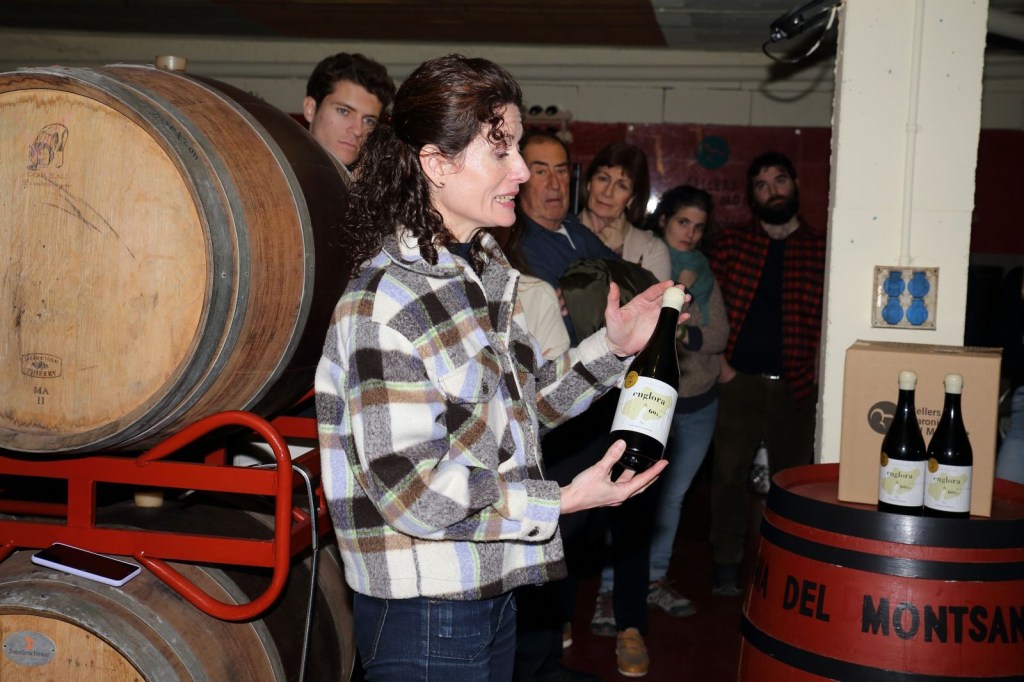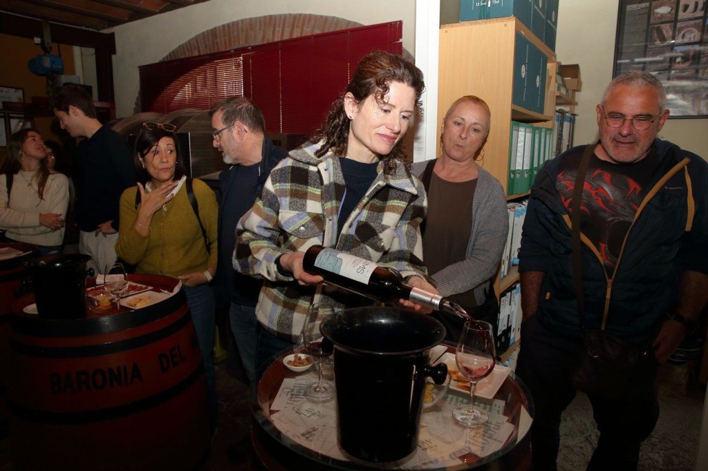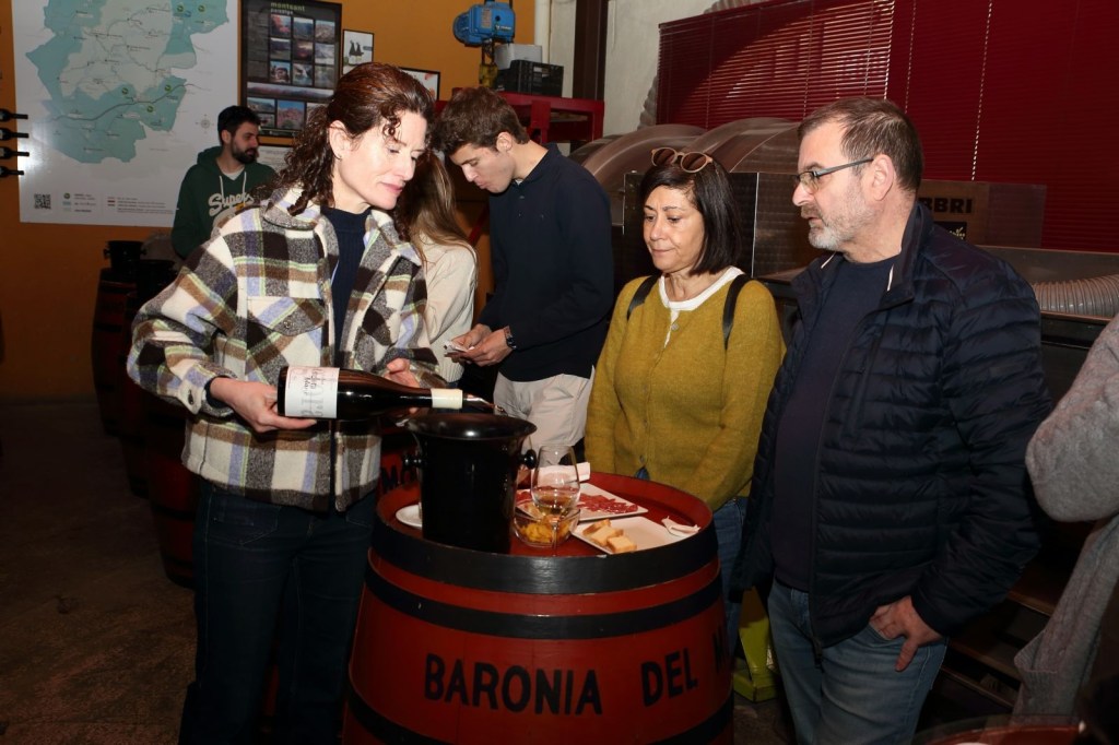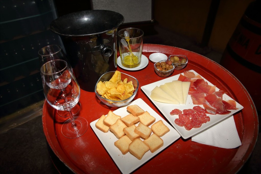 La sala és plena de bótes en fila ia cada bóta hi ha les copes per al tast i un aperitiu, comencem amb dls vins del més clar al més fosc, i de més facilitat a més dificultat en el procés d’elaboració, marinat amb un bon l’aperitiu