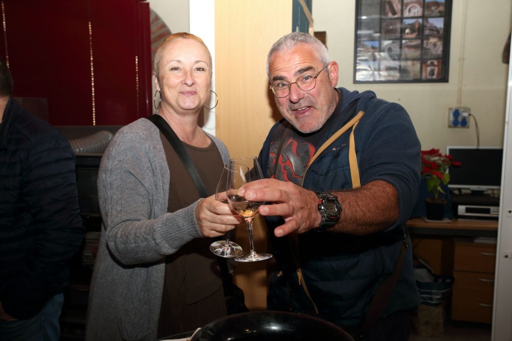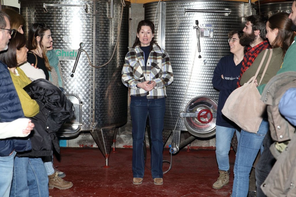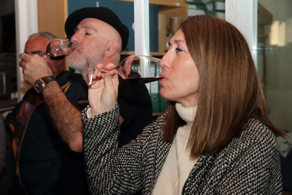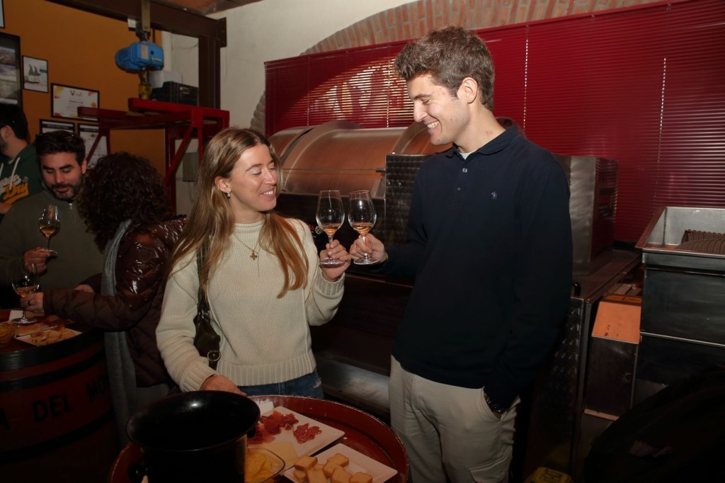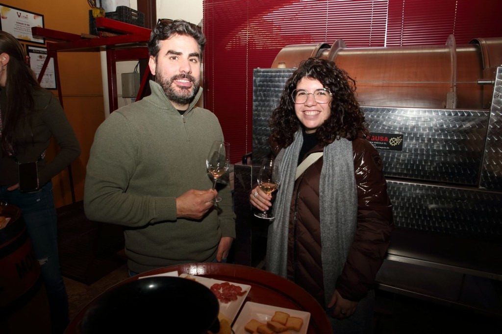 La sala és plena de bótes en fila ia cada bóta hi ha les copes per al tast i un aperitiu, comencem amb dls vins del més clar al més fosc, i de més facilitat a més dificultat en el procés d’elaboració, marinat amb un bon l’aperitiu
