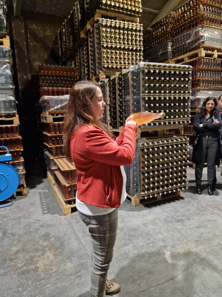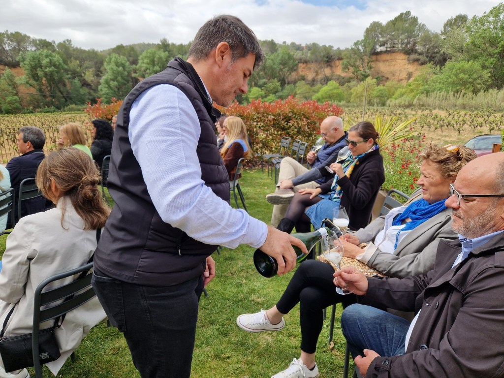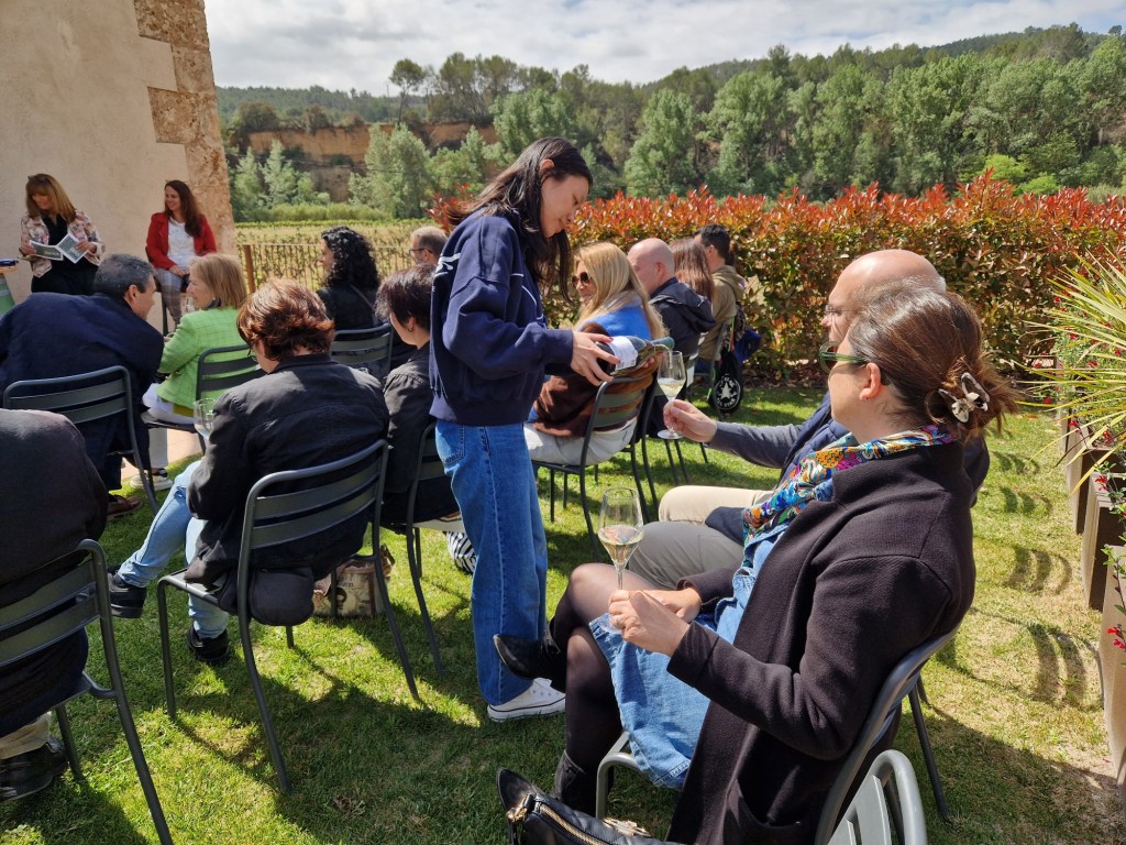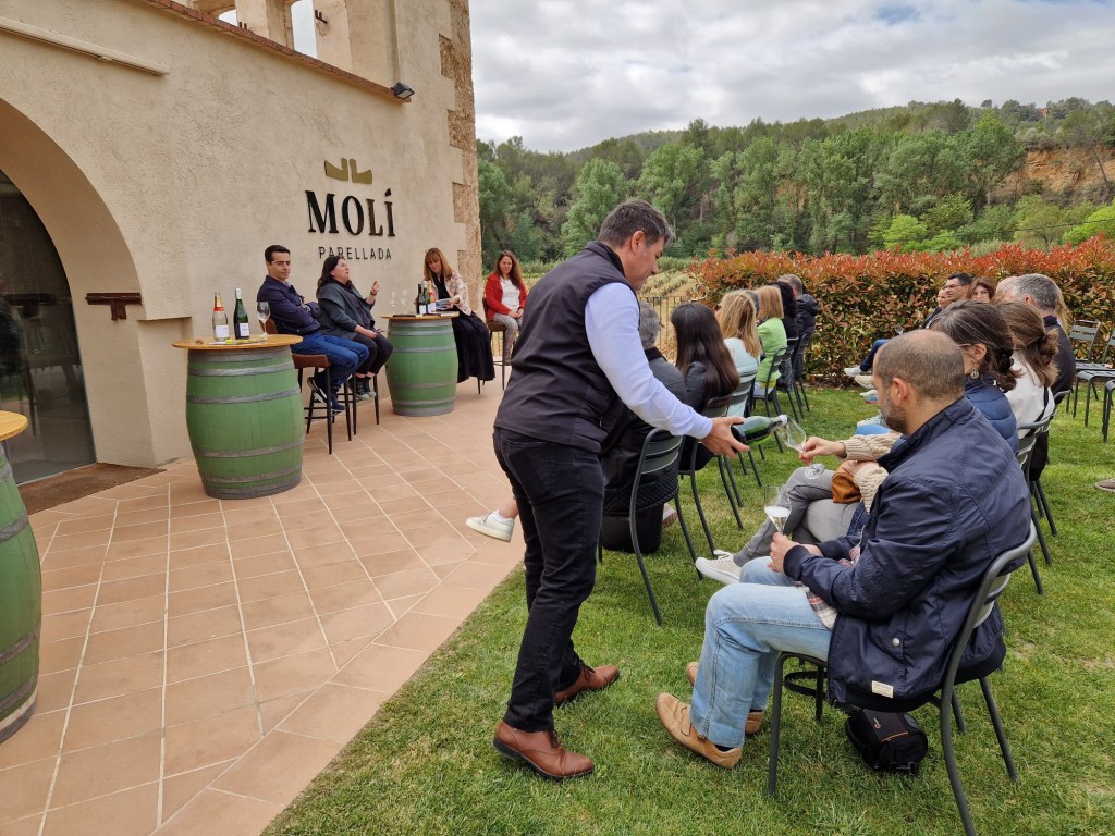 Es va presentar al bonic jardí del Molí Perellada, on ens esperaven, a tots els presents, el Francesc i la seva dona la Julia, que en són els propietaris i ens van donar la benvinguda i abans de començar amb el marinatge literari, ens van explicar la història de el seu inici pel pare del Francesc a Sant Sadurní d’Anoia i com el 2016 es traslladen al Molí, que és un antic molí de paper situat a Torrelavit i després ens van fer la visita pel celler.