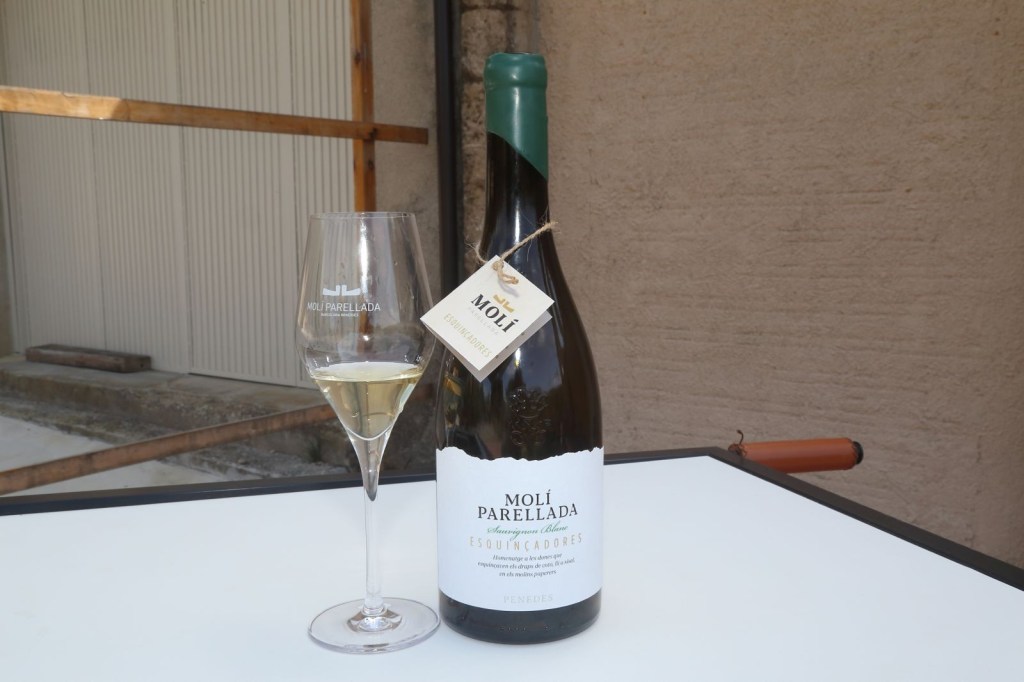 I com a tercer i darrer tastem el vi ESQUINÇADORES, Vi blanc ecològic monovarietal, 100% Sauvignon Blanc de la D.O. Penedès, amb criança oxidativa de 6 mesos en barrica nova de castanyer en les seves lies utilitzant la tècnica del battonage i 6 mesos més de criança reductiva en ampolla. Vi d’autor, embotellat sense filtrar i amb una producció limitada a 320 ampolles. A més aquest vi és un homenatge a les dones que esquinçaven els draps de cotó, lli o sisal, en els molins paperers. Per això el nom de ESQUINÇADORES,