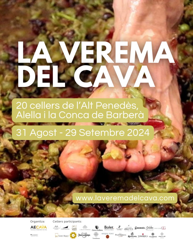 Durant cinc caps de setmana, les comarques catalanes productores de cava celebraran l’època de verema a la IX edició de La Verema del Cava. L’Associació d’Elaboradors de Cava (AECAVA) ha fet públic el programa d’activitats d’aquest festival que enguany tindrà lloc a vint cellers associats patronal del cava. Del 31 d’agost al 29 de setembre, cada celler oferirà experiències ben originals, tant de dia com ja entrat el capvespre. De la mà dels responsables dels cellers, de viticultors, d’enòlegs i d’experts en enoturisme; els visitants podran acostar-se a les vinyes per viure de primera mà unes de les èpoques més especials del nostre territori, la de la verema.