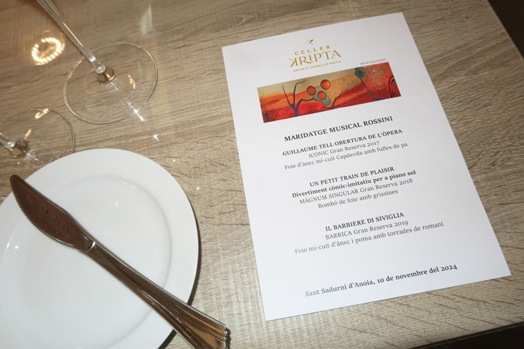 Alguna vegada heu realitzat un maridatge Musical? Aquest diumenge passat vam anar al CELLER KRIPTA, situat al cor del Penedès, a Sant Sadurní d’Anoia, del que ja us hem parlat diverses vegades i us seguirem informant de les sensacionals experiències que van realitzant, com la que vam tenir el plaer d’efectuar nosaltres de MARIDATGE MUSICAL ROSSINI, simplement espectacular. Com la seva obra mestra: el cava KRIPTA, reconegut com un dels grans escumosos del món. Com en totes les experiències, allà hi havia la Gemma Torello i la seva filla Sofia, que, com sempre, ens van atendre, a tots els assistents, amb un tracte afectuós i familiar que fa que et sentis com a casa. Així com el propietari el Sr. Agustí Torelló i la seva Sra. la Carme Sibill, que, imperecederament, són presents i són molt cordials i propers, un celler i una família encantadora.