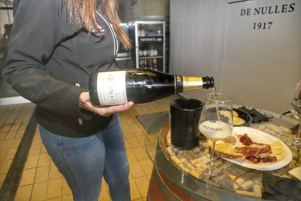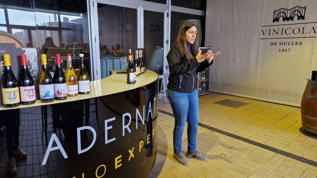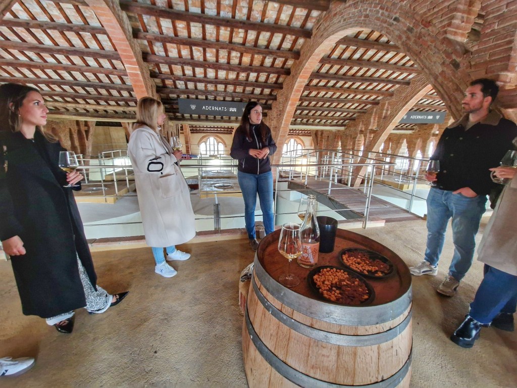 Com us dèiem, comencem a la botiga davant d’un gran mapa, amb una copa de cava de benvinguda, el Reserva Brut Rosat ADERNATS, Trepat 100%, varietat autòctona del nord de Tarragona, un cava de més de 20 mesos, excel·lent. Aquí La Serra, ens va indicar les parts que comprenia la visita i vam iniciar la mateixa davant d’aquell gran mapa, amb copa a mà, on ens va explicar la història de com es va formar el celler. ADERNATS Vins & Cavas, és un celler modernista de 1917, ubicat a Nulles (Alt Camp) un territori on el temps transcorre a poc a poc. Entre parets de pedra i maó, s’elaboren vins i caves a gerres centenàries. Dissenyades, com l’edifici, per l’arquitecte Cèsar Martinell, el celler és l’orgull i l’emblema d’un poble que escriu amb vi la seva història.