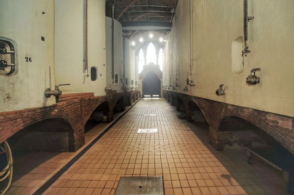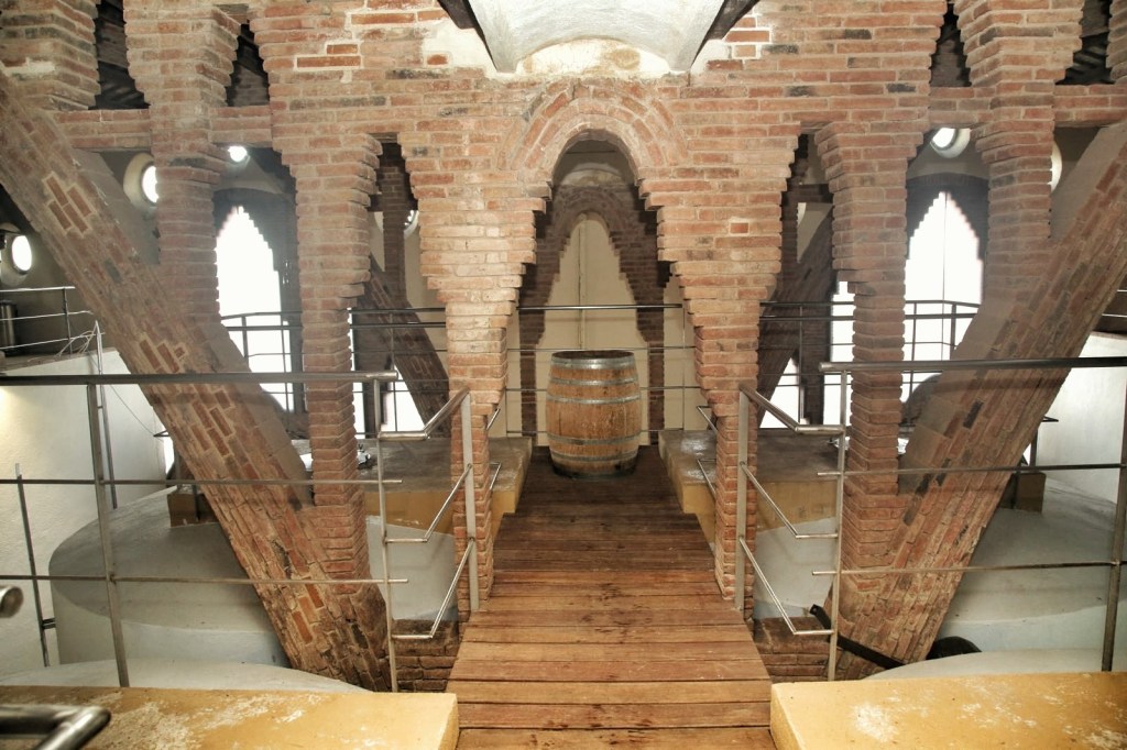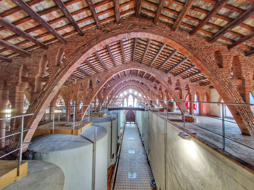 L’edifici consta de tres cúpules i cadascuna es comunica amb l’altra per un pont de fusta. Aquesta és la part interior d’aquest edifici emblemàtic, que va edificar un dels màxims exponents del moviment modernista, com ja us hem dit el Cèsar Martinell, destaca no només per la bellesa, sinó per reunir totes les qualitats necessàries per a l’elaboració de vi. Els arcs parabòlics arriben a la seva plena bellesa amb la llum. És espectacular.