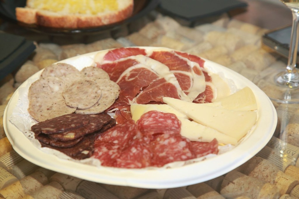 Finalment, a una sala, iniciem un complet maridatge amb embotits, pa i formatges, tot de la botiga de queviures i el forn del poble. El pa estava banyat amb un bon oli que ells mateixos elaboren i venen al públic. Tot això marit amb: