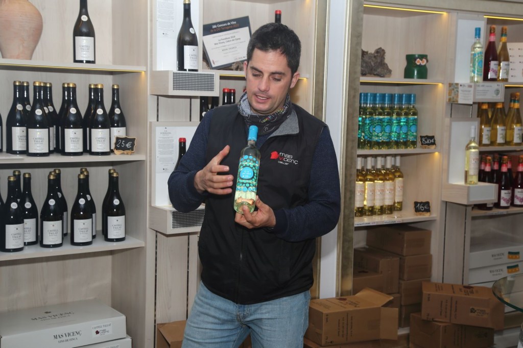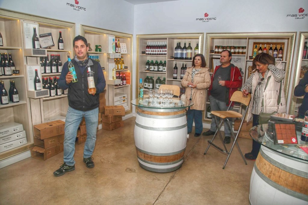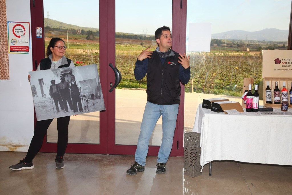 Un cop estàvem tots, a la botiga, per cert, molt bonica, ens va donar la benvinguda i ens va comentar que el tast es realitzaria al recorregut i constaria de vi, oli i vinagre, tot el que elaboren i més, com mel, etc . (descobriu-ho). Va començar explicant la història del celler, es l’any 2005, quan el fill gran de la cinquena generació i oportunament el següent el Vicenç de la saga familiar, que comencen a elaborar-se els primers vins de Mas Vicenç, i el 2011 s’uneix al projecte el seu germà Xavier, i és així com neixen uns vins moderns i de caràcter atrevit que marquen un camí per reevolucionar la tradició. Actualment són els dos germans i el seu pare el Francesc Ferré i la seva mare la Maria Morató, els que porten el celler. Una història que va valer la pena escoltar-la per boca d’un dels seus emprenedors, amb anècdotes curioses.