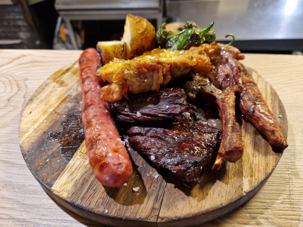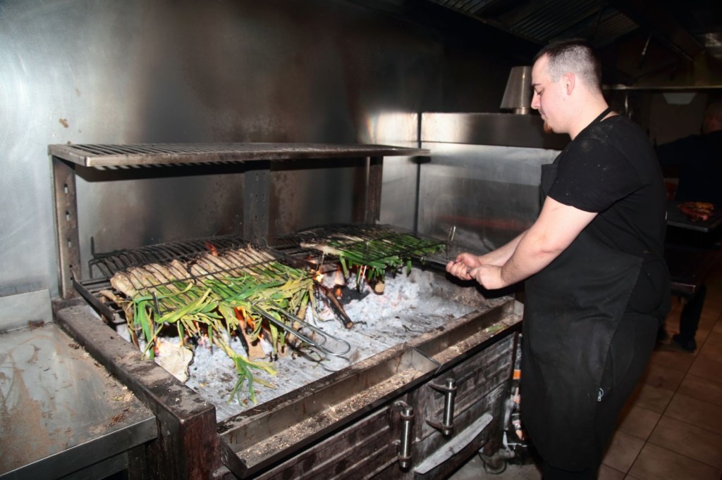 El segundo plato permite elegir entre la emblemática Parrillada Mamut, que incluye pluma ibérica y una selección de carnes a la brasa acompañadas de patatas al caliu o judías de Santa Pau,