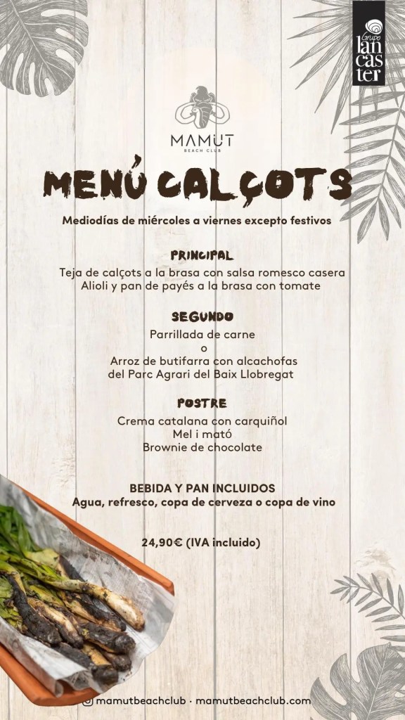 Mamut Beach Club, uno de los referentes gastronómicos más destacados del Baix Llobregat y parte del prestigioso Grupo Lancaster, inicia la temporada de calçots con una propuesta única;el Menú Calçotada que combina la autenticidad de la tradición catalana con productos de proximidad y un entorno que invita al disfrute, acompañados de suculentos arroces y carnes a la brasa, en un entorno único, a tan solo 15 minutos de Barcelona , y con parking gratuito para los clientes.
