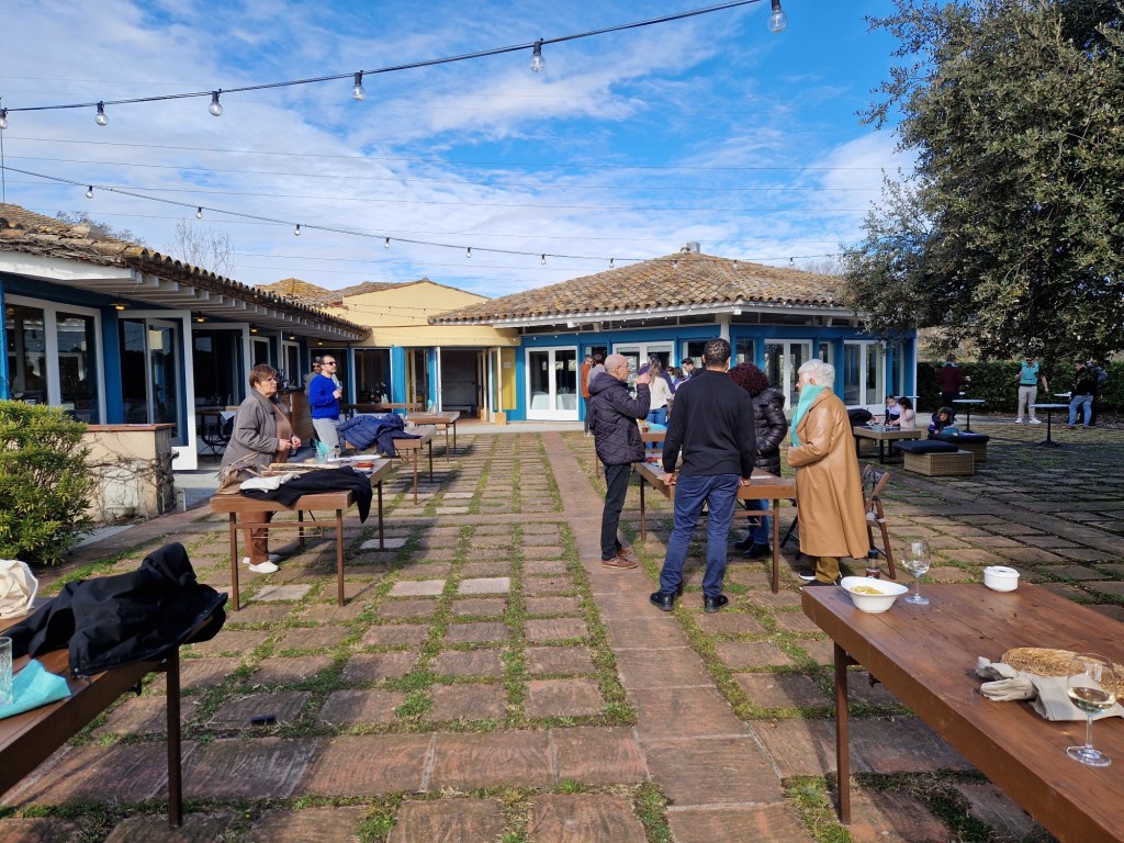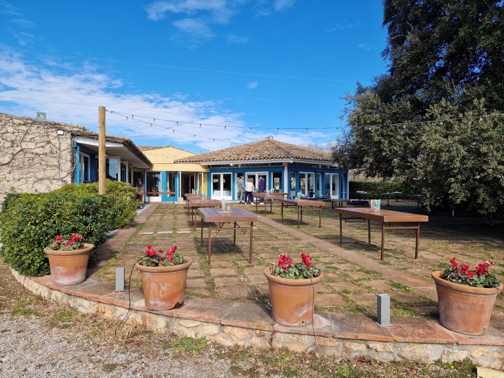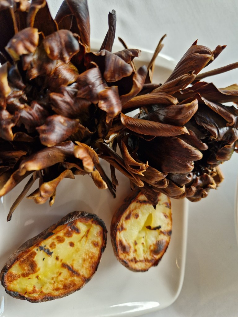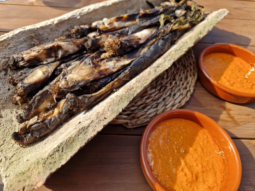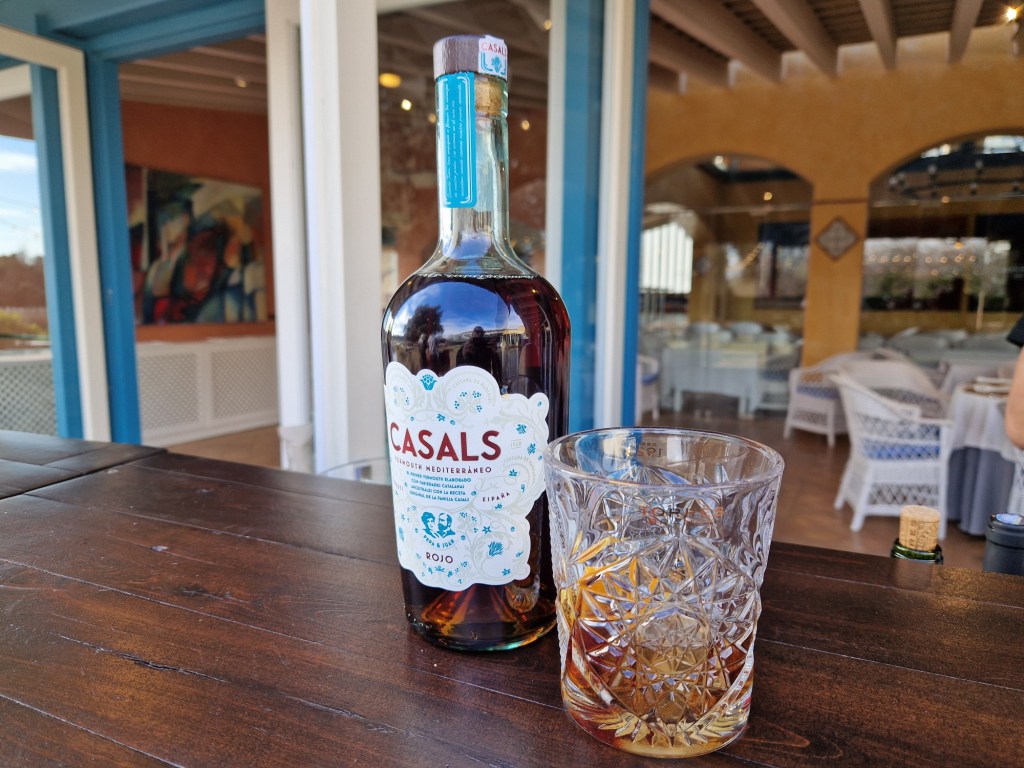 Comencem al bell jardí, amb increïbles i incomparables vistes a les vinyes, amb un aperitiu de Casals Vermut, Xips i olives, després, al mateix lloc, ens van portar el primer plat que consta d’una generosa teula de calçots amb salsa romesco. Allí gaudim del sol i les vistes, menjant tranquil·lament els calçots. Un espai màgic perfecte per a l’experiència.