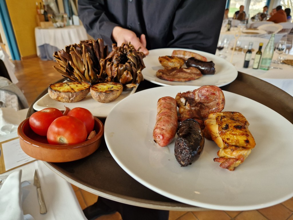 Posteriorment passem a una gran i preciosa sala connectada al jardí, la sala Parellada, amb unes meravelloses vistes i llum natural que entra a través dels seus enormes finestrals, per seguir amb el plat principal de Graellada de carn amb guarnició de Pebrot escalivat, carxofes a la brasa, patates rostides i amanida verda.