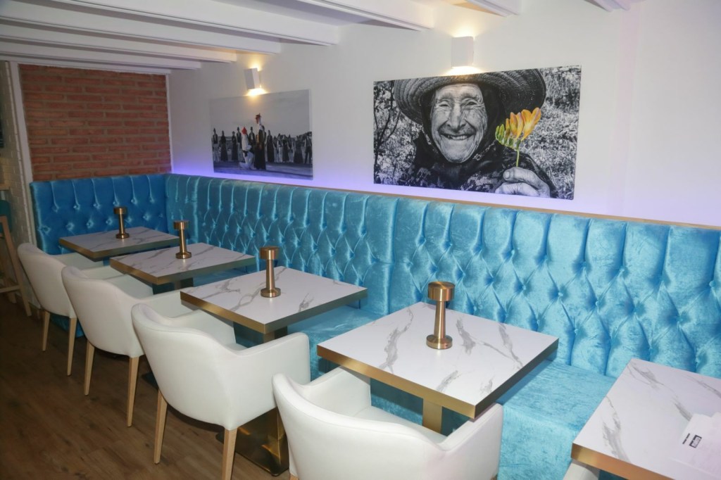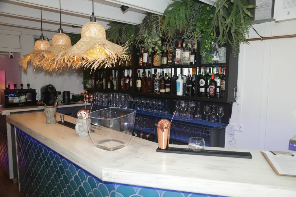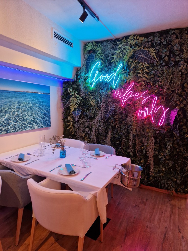 Els tons suaus i naturals, on el color prevalent és el blau turquesa, els detalls de fusta i la vegetació creen un ambient que recorda les costes de l’illa, la il·luminació càlida i el disseny asseguren una experiència acollidora i sofisticada, una decoració que convida a la calma i la desconnexió. Quan entres, ja respires i veus Formentera, Mediterrani, i et trasllada a un entorn idíl·lic.
