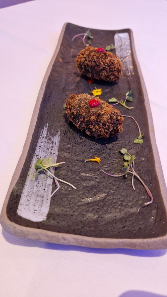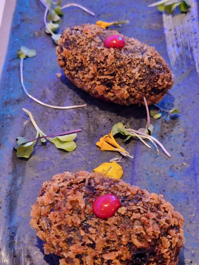 Croquetes de calamar amb sobrassada. (la combinació de la suavitat del calamar amb la potència de la sobrassada crea una experiència gustativa única, amb una textura cremosa per dins i cruixent per fora.)