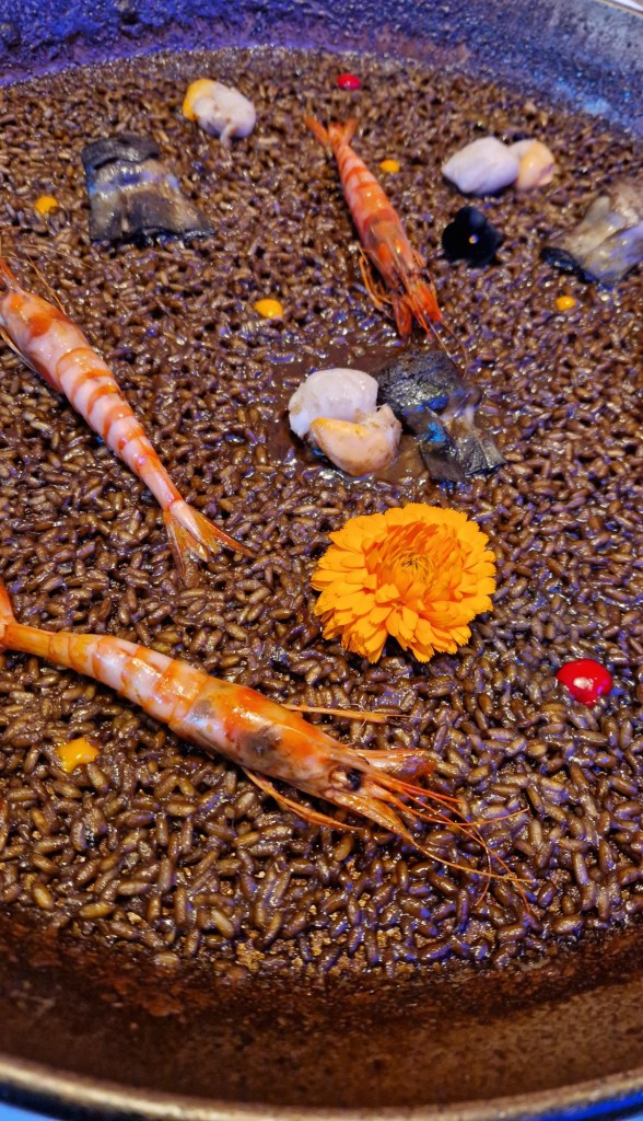 Arròs de carxofa, vieira i gamba vermella. (El resultat és un arròs melós que absorbeix tots els sabors del brou de marisc on es cuina, oferint un gust profund i enriquidor, adornat amb la dolçor natural de les gambes i el toc terrós de les carxofes.)