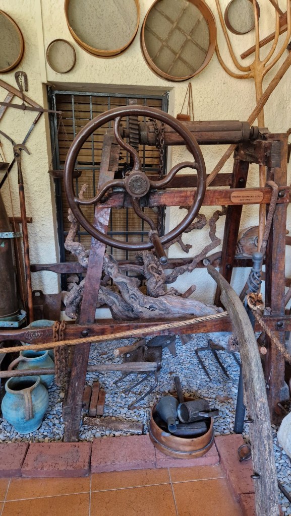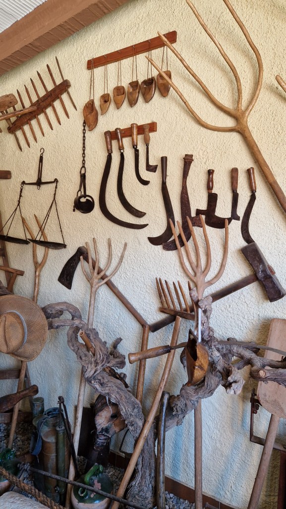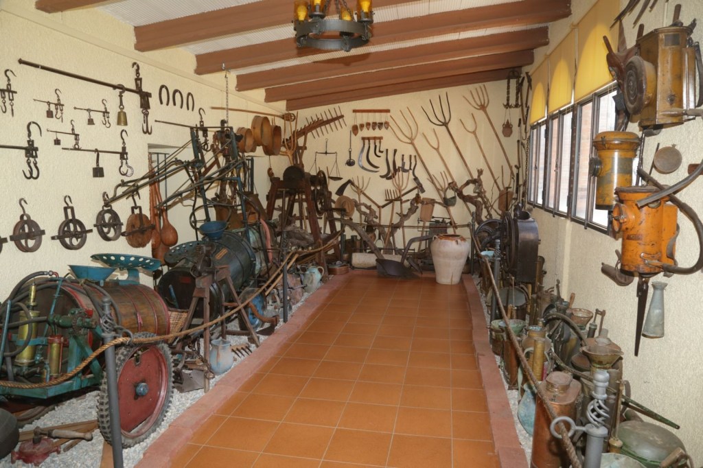 Passem a la sala on hi ha el museu a la viticultura, les eines del camp i de la vinya les han agrupat en una sala amb vista a l’exterior, on s’exposen una àmplia col·lecció de sulfatadores manuals de pressió i de tracció animal, sulfatadores manuals, forques, podadors, utensilis de boter, romanes i brabants.
