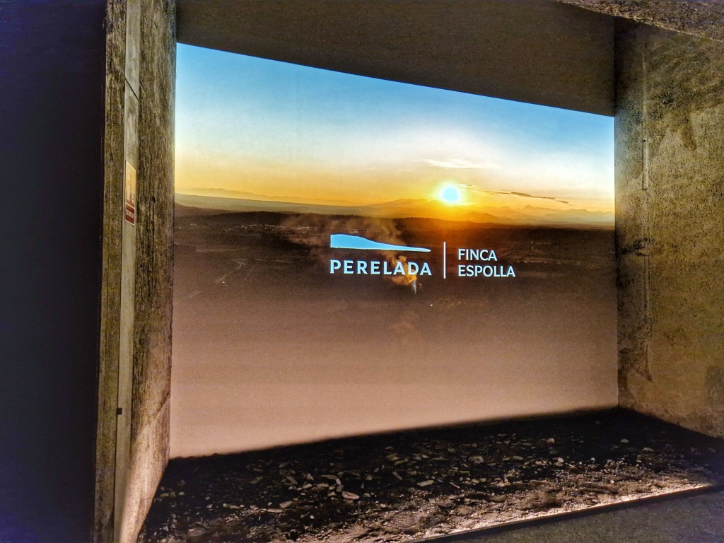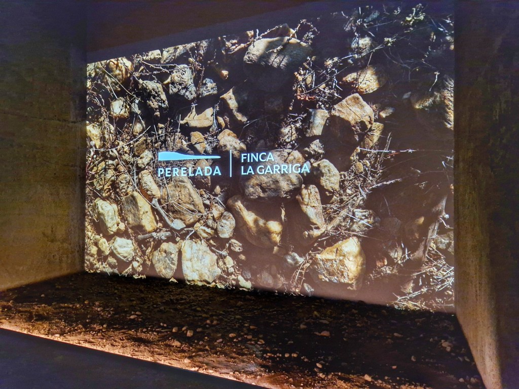 Vam passar a un petit auditori, on en una enorme pantalla vam veure i vam escoltar la història de la família i el seu projecte, extraordinari, Sortim i en un ascensor, vam baixar al celler, un celler realitzat tot de ciment, però, que, el ciment va agafant diferents relleus als diferents espais del celler. Un modern celler amb un laberint semifosc, amb unes tènues llums a terra que et van dirigint el camí. En el recorregut, al sector corresponent a cada terrer es projecta un vídeo perquè el visitant se senti transportat a les vinyes, les 5 finques que atresoren, apareixent primer i per ordre: la finca Garriga, Finca Pont de Molins, Finca Malaveïna. Finca Espolla i Finca Garbet. Així mateix, i sota cada vídeo hi ha una mostra del terrer de cadascuna de les finques. Una posada en escena fantàstica per conèixer les vinyes.