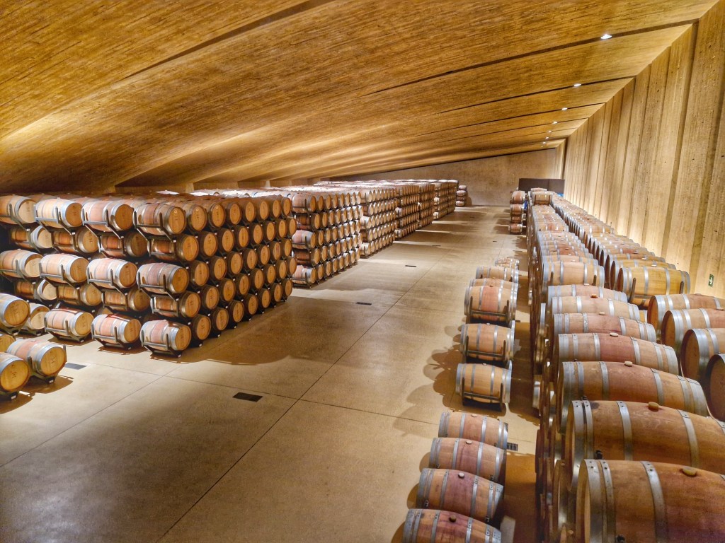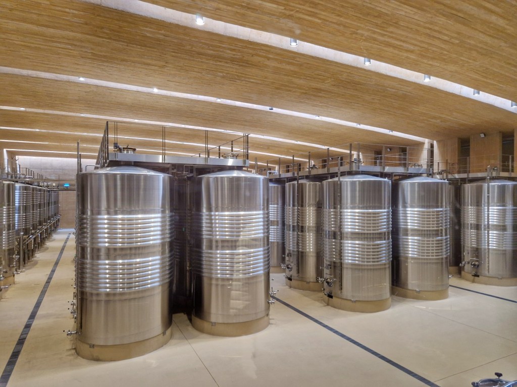 Arribem a la sala de dipòsits d’acer inox, que es veuen des de la passarel·la per on passem ia través d’un vidre enorme. Seguim fins arribar a la gran sala de bótes (de roure principalment francès), en un context de parets de formigó que imita la fusta i són inclinades Seguint el trajecte arribem a la sala d’ampolles i posteriorment a la biblioteca de les ampolles, on, entre d’altres, hi ha ampolles de la Finca Malaveïna del 1998 fins al 2020.